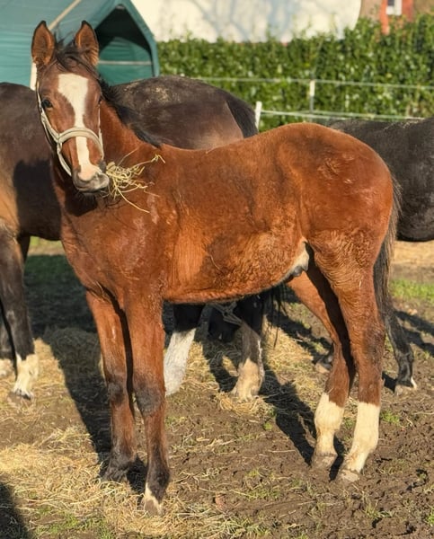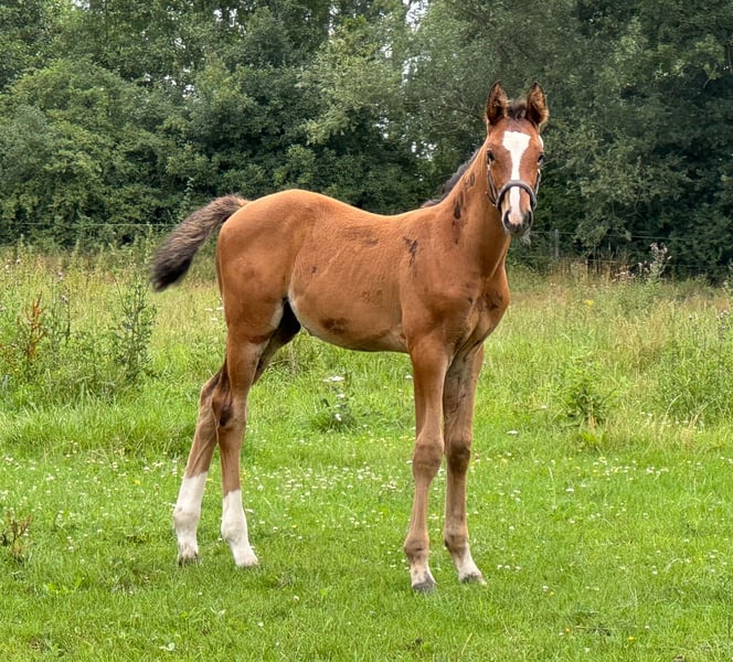 Holsteiner colt by Stanley x Stanfour / Canturo / Colman from a highly successful dam line. Stanlee is a very long-legged, handsome, and well-marked colt sired by Stanley out of our Farena. He is a stallion with a strong individual recognition factor, an elegant head, and excellent basic gaits. His dam, Farena, is a daughter of Stanfour / Canturo / Colman / Corofino I / Lord from the Holsteiner Stamm 1223 and sister to the mare Chanel BS, who competes successfully at 1.45 m level internationally with Ann-Sophie Seidl. In the immediate maternal line, there are internationally successful and winning names at 1.60 m level, such as Sir Sandro BS (Steffen Eikenkötter), Best of Berlin BS (Edwin Smits), and the licensed stallion Number One (Maksymilian Wechta), who was recently licensed in Westphalia and already successful at 1.40 m level with Dryad BS (Steffen Eikenkötter). Dryad BS also belongs to Farena’s direct maternal line. The powerful jumping sire Stanley is a Hanoverian Grand Prix winner, descending from Stakkato / Loredo / Graphit / Gotthard. With Eva Bitter, he won the Hanoverian Show Jumping Championship in Verden and took victory in the small final of the Bundeschampionat in Warendorf. Stanley also has offspring successful at international 1.60 m level. Additionally, he has produced numerous high-priced progeny sold at riding horse and foal auctions. He is renowned for passing on his exceptional rideability and honest character to his descendants. Stanley has been consistently ranked among the top in the FN breeding value evaluations for young horse competitions for years.
