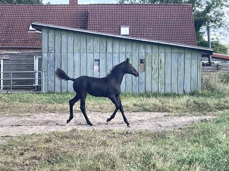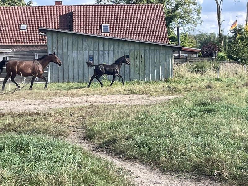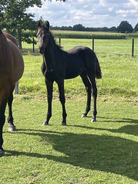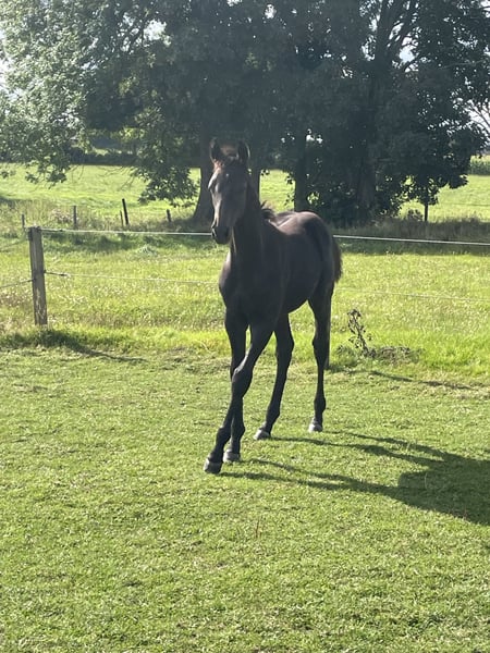 This charming colt captivates not only with his noble type and elegant appearance but also with three expressive, elastic basic gaits that exhibit a lot of rhythm and energy. Especially his ground-covering trot with beautiful shoulder freedom and his powerful hindquarters make him a real eye-catcher. His pedigree is highly interesting for equestrian sports: Duplexx – modern sport type with elegance and excellent movement quality. Crawford – known for substance, willingness to perform, and rideability. Dolany (Donnerhall line) – a guarantee for the best dressage genes with an outstanding temperament. His high quality has already been recognized with a foal premium – a sure sign of his exceptional potential. In addition to his athletic abilities, he also impresses in daily handling: Raised in a loving family environment, he is already halter-trained, gentle, and well-behaved. With his friendly character and curiosity, he brings joy to everyday interactions. A foal that immediately enchants with his charm and presence and brings the best prerequisites for a successful future with his pedigree.