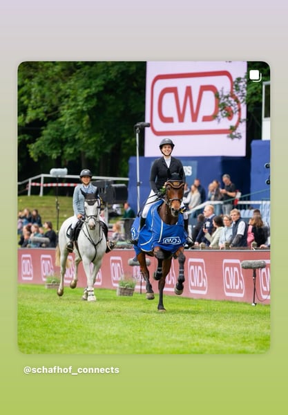 Serii zwycięzca w skokach przez przeszkody do poziomu M. Ostrożny, wybacza błędy, zawsze chce się podobać. Zeus to bardzo kochany wałach, którego kupiłam (amatorska jeźdźczyni) jako 4,5-letnie źrebię od hodowcy i samodzielnie go wyszkoliłam. Od pierwszego startu był od razu plasowany i uzyskał kilka ocen 8 w konkursach skoków dla młodych koni aż do poziomu M. Również w konkursach stylowych otrzymuje oceny 8. Trzy lata temu oddałam go mojej 11-letniej córce. Zaczęła od skoków i w tym roku świetnie poradziła sobie ze wszystkimi konkursami dziecięcymi. Wygrała indywidualnie w Pucharze Narodów na 130 m. Moja córka skacze z nim sama od dwóch lat. Jest świetnie jeźdzony w ujeżdżeniu, potrafi wykonywać półobroty i galop na zewnątrz. Nie jest to jednak koń dla początkujących, ponieważ jest zbyt wrażliwy. Jest pewny w terenie, zarówno w grupie, jak i samodzielnie, i skacze przez każdy drzewo w lesie, był już nad morzem i wchodzi do wody. Życzę mu domu na 5* – dla dziewczyny lub kobiety, która chce jeździć na poziomie L i M w skokach z dużym sukcesem, albo dla dziewczyny na Children Tour. To absolutnie niezawodny koń.