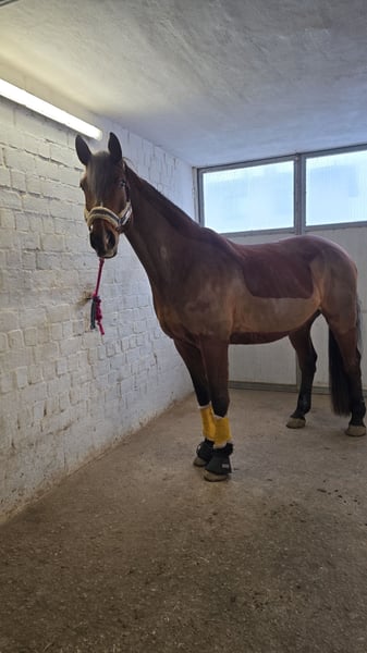 I am selling this elegant bay gelding on behalf of the owner. Born in 2014, he stands impressively tall at 180 cm, but what truly makes him special is his temperament. He is clear-minded, absolutely fearless, and always honest – a horse you can't help but fall in love with. This versatile leisure horse impresses with his calm and balanced nature, as well as his pleasant temperament. The gelding is well-ridden and consistently friendly and cooperative in handling. Ideal for riders seeking a reliable and characterful leisure horse. A true all-rounder suitable for relaxed rides as well as small jumps. Hoog is bombproof, having grown up around tractors, excavators, and other animals, which leaves him unimpressed. He is not a kicker, bucker, or sensitive – just a gentle giant who may need a little patience for certain things. He enjoys going out on trail rides and remains calm whether alone or in a group. Fast-moving dogs don’t bother him either – he truly has nerves of steel. He is shod in front, and this should be maintained. Under saddle, he is willing and cooperative. Whether for groundwork or riding out – Hoog gives his best. However, his size also brings responsibility. To stay healthy in the long term, he needs regular exercise, targeted muscle development, and some training. He is not a “stabled” horse – he needs to stay active. Due to a minor cosmetic issue, this is especially important. He has a rooster comb, which has been veterinary checked and does not restrict him in any way. Hoog is not a “sport machine,” but a horse with great potential and a heart of gold. He needs people who love him for who he is! We are looking for a 5-star home where he will be appreciated for his lovable and people-oriented nature. A simple box stall is not sufficient; he needs at least a paddock box with a large paddock. The ideal situation would be an open stable with plenty of turnout space. A visit by the new owner prior to purchase is preferred. A properly fitted saddle and hoof boots can be purchased together. Saddle €2,000 negotiable (original price €4,999) Hoof boots €180 (original price €250) Additional equipment is included. No sales to dealers or riding schools, as he prefers a fixed person to bond with. To prevent riding tourism, we charge €35 for trial rides, which will be deducted from the purchase price. If you are interested or have questions, I look forward to hearing from you.