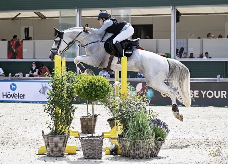 Vincitore di numerose gare di salto. È molto gentile e perdona volentieri gli errori. Zeus è un cavallo stallone estremamente affettuoso, che ho acquistato (come amazzone dilettante) da un allevatore a 4,5 anni, ancora al suo stato brado, e che ho addestrato personalmente. Fin dal suo primo concorso si è sempre piazzato, ottenendo numerosi voti 8 in prove di salto per cavalli giovani fino a livello M. Anche nelle prove di stile ottiene sempre voti 8. Tre anni fa l’ho dato a mia figlia, allora 11enne. Lei ha iniziato a saltare con lui e quest’anno ha superato con successo tutte le prove per bambini. Ha vinto un singolo nel Nations Cup sui 130 m. Da due anni, mia figlia lo cavalca da sola. È fantastico anche in dressage, sa fare traversali e galoppi laterali. Tuttavia, non è un cavallo adatto ai principianti, poiché è molto sensibile. È sicuro in campo, sia in gruppo che da solo, e salta anche sopra ogni albero nel bosco. È già stato al mare e sa nuotare nell’acqua. Desidero per lui una casa 5* con una famiglia che desideri cavalcare con successo a livello L e M o un’ammiratrice per le prove Children. È un cavallo assolutamente affidabile.