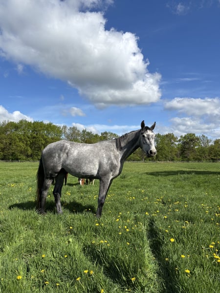 We are selling our Holsteiner gelding "Condor," sired by Crack x Livello. He is always gentle and affectionate in handling. His last summers were spent in large stallion groups on a spacious pasture, allowing him plenty of time to grow. Due to his current height of 1.86 m, he has not yet been backed, as we wanted to give him enough time to develop. Now, he is ready to explore new paths and get to know his rider. In January of this year, he underwent a chip operation on his hind left fetlock joint and his hind right knee. The surgery was very successful, and he shows no irregularities in movement. X-rays from the clinic confirm complete healing. According to prognosis, the operation will not affect him in his future life, and several veterinarians agree that a sporting career remains very much possible. On his forehead, he has two bony "horns" that developed during growth. After consulting with various vets, we understand these are purely aesthetic and do not impair him in any way. This feature makes our Condor particularly special. We hope to find a lovely new home for our Condor. Videos and his X-ray images can be provided upon request. As we are currently reducing our Holsteiner breeding program, please also take a look at our other listings.