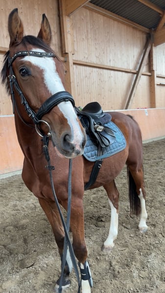 À vendre, le hongre de mon amie, qui a pris la décision très difficile de s'en séparer. Donut est en sa possession depuis son âge de poulain et a grandi dans notre établissement de manière appropriée, mais familiale, en troupeau. Au fil des années, il est malheureusement devenu évident que Donut n'est tout simplement pas le cheval qui lui convient, et nous sommes donc à la recherche de quelqu'un qui apprendra à l'aimer avec toutes ses particularités. Il a été monté doucement à l'automne/hiver 2024. Il a eu une pause de trois mois au printemps et est actuellement en entraînement de remise en forme. Il se laisse monter dans les trois allures de base dans le manège et sur le terrain extérieur. Il a également réussi ses premiers sauts avec assurance et enthousiasme. Il connaît le terrain uniquement en main, chez le maréchal-ferrant, il est sage et se déplace sans problème chez nous, pieds nus. Il n'a pas encore été transporté régulièrement en van. Il a tendance à pincer, tant en box qu'en stabulation libre. Nous recherchons pour Donut un cavalier sûr et cohérent, qui possède la calme et la patience nécessaires pour travailler avec ce cheval très sensible. Avec le savoir-faire adéquat, il peut certainement devenir un partenaire sportif fiable.