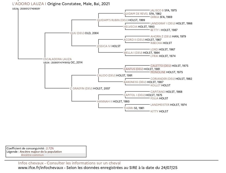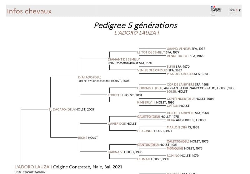 L’Adoro Lauza I ha un pedigree di ottima genealogia Holsteiner, arricchito da aggiunte di successo nel sangue Selle Francais approvate dal Verband Holsteiner: Diamant de Semilly e Quidam de Revel. L’Adoro è stato allevato nel sud della Francia e registrato OC (origine constatata da IFCE, Haras Nationaux e Cadre Noir). Sia il stallone che la fattrice di L’Adoro provengono dalla leggendaria linea di sangue Holsteiner Stamm 18B1, riconosciuta più volte come una delle migliori linee di fattrici in Europa per il salto ostacoli, non solo in Holstein e Germania, ma in tutto il continente, come attestano numerosi studi e recensioni (allego una delle molte analisi sulla linea Stamm 18B1). Il sire di L’Adoro è El Dacapo (allevato in stallone privato, vedi pagina genealogica 1). El Dacapo è un Holsteiner della linea Stamm 18B1. Suo padre, Diarado, è uno degli stalloni Holsteiner più apprezzati e di alto livello in Germania, con oltre 100 figli licenziati a livello internazionale e numerosi discendenti di successo, che rafforzano la scelta di integrare il sangue Selle Francais di Diamant de Semilly nella sua linea Holsteiner di élite. Durante la carriera agonistica, El Dacapo ha partecipato al prestigioso Bundeschampionat tedesco, arrivando fino alla finale nella categoria dei cavalli di 5 anni. Da allora, ha continuato a servire il suo gruppo di fattrici, tutte originarie della stessa celebre linea Stamm 18B1. I pedigrees di El Dacapo e delle sue fattrici derivano da due rami diversi della linea 18B1, risalendo a Dorette (1945) e alla sua figlia Adrette (1964), considerate da molti come le fattrici chiave della leggendaria linea Stamm 18B1. Tra i figli più influenti di queste due cavalle si annoverano forse Farn, Ronald e Roman. Roman, nato dall’incrocio tra Dorette e il grande Shagya-Arab Ramzes X, compare cinque volte nel pedigree di L’Adoro. La fattrice di L’Adoro, Escaladora Lauza (vedi pagina genealogica 2), proviene anch’essa dalla linea Stamm 18B1 ed è figlia del stallone Quu (allevato in stallone privato). Quu ha raggiunto il livello 1,40 m nel salto ostacoli prima di essere ritirato a causa di un infortunio, un evento positivo per le sue fattrici. Suo padre era Quidam’s Rubin, stallone licenziato in Oldenburg e Holstein, tra gli altri studbook. Sebbene la sua carriera di stallone sia stata breve, ha già ottenuto grande successo con 30 figli licenziati e più di 202 discendenti che si sono distinti nel salto ostacoli a livello avanzato (S), accumulando oltre 1,75 milioni di euro di premi in denaro, come evidenziato nell’articolo allegato. Quu era un Holsteiner di buona linea, discendente di Landgraf I (che ha prodotto cavalli di 1,55 m) e della celebre linea di sangue di Quidam de Revel, proveniente dai rinomati stalloni Ibrahim, Alme e Jalisco. La fattrice Jessica, figlia di Quu, discende da Accord II, stallone Holsteiner di alto livello internazionale per risultati in competizione e numero di stalloni licenziati e di successo nel salto ostacoli (suo padre era Alme). Per quanto riguarda la linea materna di Jessica (Holsteiner Stamm 504), si può citare ad esempio la bisnonna Flandia, e la sua nipote Operette la Silla, nota cavalla da salto che ha gareggiato a livello internazionale in 1,60 m. Se sei un cavaliere amatoriale avanzato o un professionista del salto ostacoli, l’incrocio con generazioni di stalloni e linee di fattrici di successo aumenta le probabilità che L’Adoro Lauza I possa valere il tuo tempo e il tuo impegno, e potrebbe essere il cavallo da salto che hai sempre cercato.