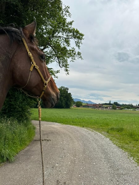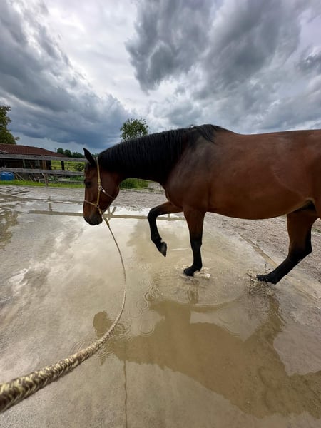 Verkauft wird hier ein Hollsteiner Wallach aus dem Jahr 2017 Viola XLIII × Centimor Wichtige Fakten: - läuft Barhuf (kennt aber auch Teilbeschlag) - braucht Offen- oder Aktivstallhaltung (er braucht die Bewegung, er zeigt sich von mittlerem Rang, ist aber mit anderen Wallachen eher verspielt) - ca 1.80m - Freizitmäßig geritten - regelmäßig geimpft (zuletzt 11/25) + entwurmt (zuletzt 03/26) - Zähne wurden 12/24 das letzte Mal gemacht - geht sowohl alleine als auch in Begleitung gut ins Gelände, wobei er sich alleine etwas schreckhafter zeigt - ist fein an den Hilfen und super lernwillig - am Boden benötigt er eine klare Führung, mit emotionalem Verhalten kann er nicht umgehen, anfangs ist er immer etwas unsicher und möchte gefallen - er ist ein total lieber, verschmuster Kerl, der manchmal denkt er sei ein Minishetty und kann sich auf "Mamas" Schoß setzen, vorallem wenn er ängstlich ist. Er sieht gerne mal Gespenster, lässt sich aber mit etwas Zeit und Geduld wieder beruhigen, ansonsten ist er sehr bewegungsfreudig und braucht vieeel Auslastung - verladen ist Tagesform abhängig, mal geht er sofort rein, mal dauert es, was er hier garnicht mag ist Druck - ist inklusive Zubehör (wenn gewünscht) - es besteht der Verdacht auf ECVM, die Tierärztin sagt aber, dass er trotzdem reitbar ist, sollte dafür allerdings stets gut trainiert sein -> Röntgen HWS aus 05/25 vorhanden Im Moment fehlt mir leider einfach die Zeit und die Kraft ihn zu bewegen, er kommt unheimlich zu kurz, ich würde mir für ihn jemand sehr einfühlsamen mit Verstand und Pferdeerfahrung wünschen. Aufgrund der fehlenden Bewegung ist ein Probereiten nicht möglich, es besteht allerdings die Möglichkeit ihn vorerst als Pflege bzw. dann Reitbeteiligung oder Stallgebunden zur Verfügung zu haben. Gerne versende ich auch Reitvideos. Kein Notverkauf, Platz vor Preis!
