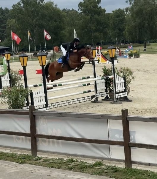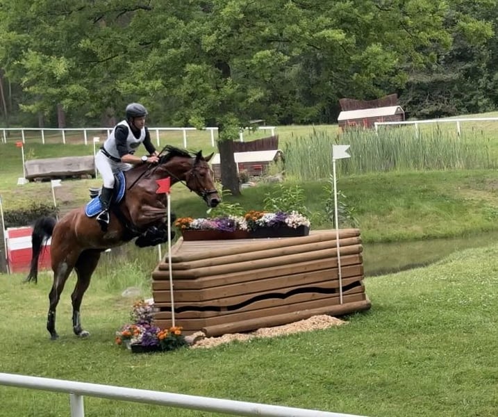 Ivy 10-jährige Holsteiner Stute von Hermes de Lux x Aloube Z Ivy ist dieses Jahr VL und CCI 2* platziert. Ivy hatte 5 j. ein Hengstfohlen von Central Park, welches über den OS-Verband mit Eliteauszeichnung versehen wurde. Ihr jetzt 4 j. Nachwuchs kann gerne bei mir angeguckt werden. Ivy ist von mir selbst gezogen (Mutter lief mit mir bis S-Springen) und nur als Fohlen in einer Fohlengruppe gewesen. Ende 2 j. ist Ivy dann zu mir gekommen. Dadurch ist Ivy erst 6 j. Auf Turnier vorgestellt worden und eigentlich als reines Springpferd ausgebildet worden. Durch einen Zufall sind wir dann in der Vielseitigkeit gelandet, so dass Ivy Ende 8 j. ihre erste VS lief. Ihre Stärke liegt in der VS im Springen. Da ist uns dieses Jahr kein Springfehler unterlaufen und konnten somit das mittelmäßige Dressurergebnis etwas ausgleichen (haben aber auch schon eine 36er Dressur geritten). Dressur ist aber auch nicht meine Paradedisziplin. Im Gelände sollte Ivy sportlich geritten werden. Ideal wäre ein/e Junior/in die z.b. vom Pony auf Pferd umsteigen möchte oder zweigleisig fahren möchte und so mit Ivy zusammenwachsen könnte. Im Winter läuft Ivy barfuß und nur während der VS-Saison mit vier Eisen. Bei ernsthaften Interesse verschicke ich gerne ein Video. Preis: 32.000 €