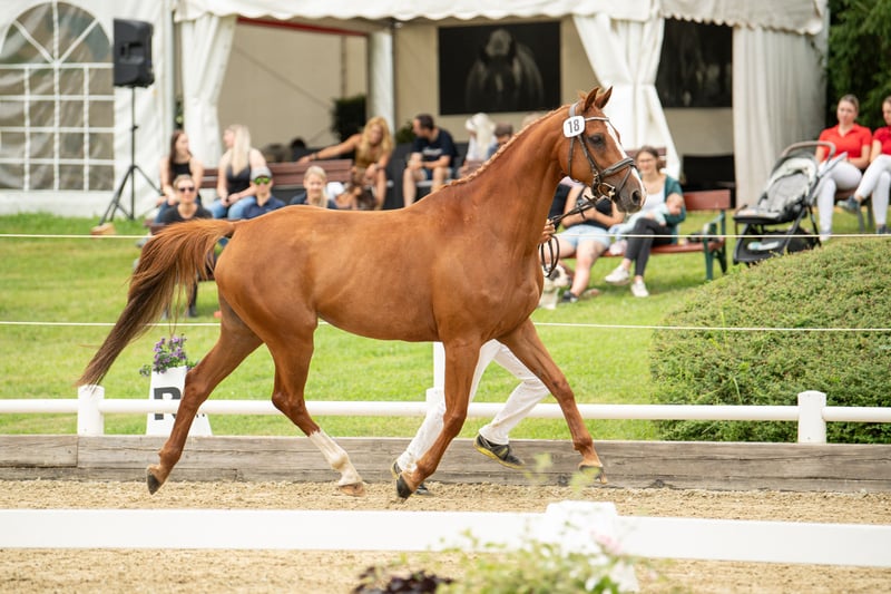 Ta elegancka klacz pochodzi od Uriko x Caretino x Rebel Z, jest pełna jakości i energii, a w 2024 roku miała już źrebię. Samodzielnie wytrenowałem ją jako 4-latkę, a na turniejach startowała do 1,20 m. Przy skokach wykazuje ostrożność, dużą pewność siebie i zapał. Technicznie opanowała ćwiczenia do klasy L, jest bardzo delikatna w jeździe, głównie za pomocą siodła. Podczas pracy na ujeżdżalni jest bardzo ambitna i zmotywowana, nie radzi sobie dobrze z presją jeźdźca i jest przeznaczona tylko dla doświadczonych jeźdźców. Miała już piękne źrebię od Keatona. Zarejestrowana jako klacz hodowlana w Austrii z doskonałą oceną 7,71 punktów, co jest naprawdę imponujące jak na pochodzenie skoncentrowane na skokach. Ponieważ wycofuję się z jeździectwa, a moje serce należy do koni północnoniemieckich, postanowiłem ją oddać.