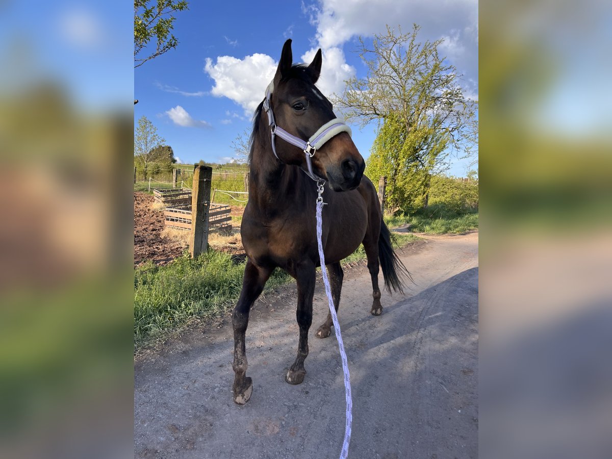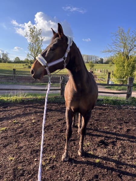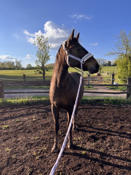 Moondance is a 16-year-old Sooty Brown Holsteiner mare. Due to an injury sustained in her foalhood, she is only conditionally rideable. Chips formed as a result of this injury, which the previous owners chose not to treat. We purchased her at age three, started her under saddle, and that’s when we noticed the issue. She was operated on, and two of the three chips could be fully removed. The third chip is located too close to the tendon. Additionally, she has osteoarthritis in her right front fetlock joint, which, with proper care, does not cause significant problems. We have gently exercised her mainly on the riding arena, mostly from the ground. She’s comfortable on relaxed trail rides at the walk, which she also enjoys on pain-free days. At the trot, she begins to limp after a few steps, with less severity in summer than in winter. We also tried breeding her. In 2023, she was inseminated with the stallion “Champion De Luxe,” but she did not conceive. She is now too old for her first foal. Moondance is somewhat (very) strong, but we are doing our best to keep her weight down (as much as her legs allow). Moondance is an absolute dream. You can do a lot of horsemanship with her; she follows behind like a dog, pays close attention to body language, and generally shows strong interest in affection and attention. Since she was never properly backed, she is not suitable for children, reintegration, or someone looking for a riding horse. Getting on her once or twice a month and taking her out on trails (either ridden or as a hand-horse) is no problem. She tends to be more dominant in her herd and defends her position confidently. She lives with us in an open stable with two other horses and two ponies, only separated during feeding. She is familiar with all kinds of noise, reliably loads onto any trailer, and is experienced with both Western and English saddles. She has an incredibly gentle mouth and is more responsive to weight and seat aids. We hope to find someone who will continue her training so she doesn’t become overly fat or have her legs overexerted, without expecting her to be ready to ride at any moment. We also want to be honest: we do not want her to become a mere showpiece. If you are looking for a riding horse, Moondance is not the right choice for you. If you are interested, please contact us. We are happy to provide more information and details, and we would be delighted if you could offer our Moondance a loving home until the end of her life. She truly deserves that.