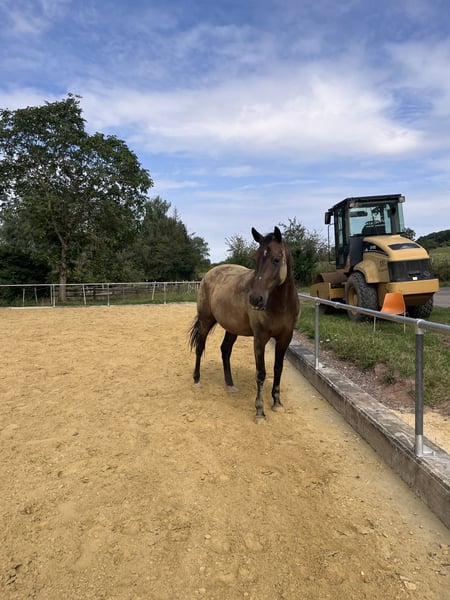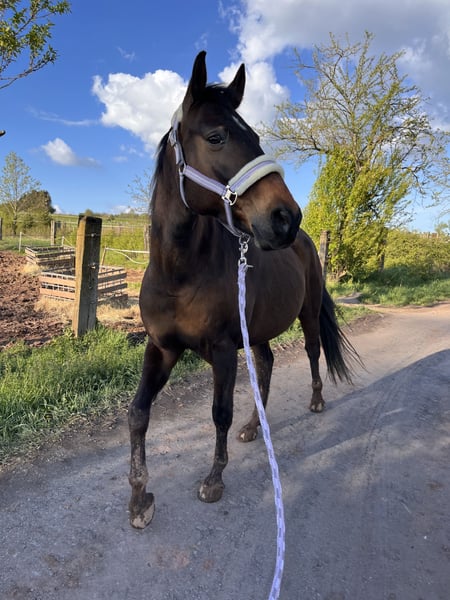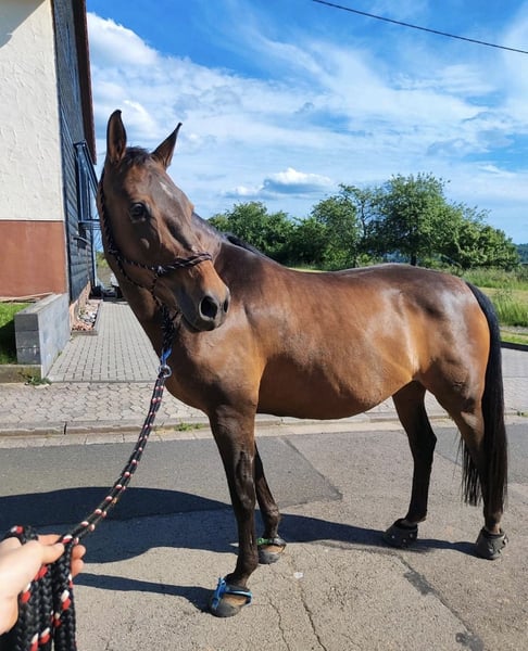 Moondance ist eine 16 jährige, Sooty braune Holsteiner Stute. Aufgrund einer Verletzung im Fohlenalter ist sie bedingt reitbar. Durch diese Verletzung bildeten sich Chips, welche die Vorbesitzer nicht behandeln ließen. Wir haben sie 3 jährig gekauft, begannen mit dem einreiten und dadurch fiel es auf. Wir haben sie operieren lassen, wobei 2 von 3 Chips vollständig entfernt werden konnten. Der 3. ist zu nah an der Sehne. Zudem hat sie im vorderen rechten Fesselgelenk Arthrose, welche bei passender Pflege aber nicht groß auftritt. Sie wurde von uns schonend auf dem reitplatz, hauptsächlich vom Boden aus, bewegt. Gemütliche Geländeritte im Schritt macht sie an schmerzfreien Tagen auch mit. Im trab beginnt sie nach wenigen Schritten zu lahmen, im Sommer nicht so stark wie im Winter. In der Zucht haben wir es auch probiert. Sie wurde 2023 vom Hengst „Champion De Luxe“ besamt, hat jedoch nicht angenommen. Mittlerweile ist sie für ein erstes Fohlen zu alt. Moondance ist etwas (sehr) zu kräftig, was wir aber so gut es geht abspecken.( so gut das mit kranken Beinen eben geht) Moondance ist ein absoluter Traum. Man kann mit ihr viel Horsemanship machen, sie läuft wie ein Hund hinterher, achtet sehr auf Körpersprache und hat generell starkes Interesse an Zuneigung und Aufmerksamkeit. Da sie ja nie richtig angeritten wurde, ist sie absolut nichts für Kinder, Wiedereinstiege oder jemanden, der ein Reitpferd sucht. Ein-zwei Mal im Monat drauf setzen, sie ins Gelände mitnehmen (ob mit Reiter oder als handpferd) sind problemlos drin. Sie ist in Herden eher Ranghöher, verteidigt ihre Position dort auch dominant. Sie steht bei uns mit zwei Pferden und zwei Ponys in einem Offenstall, wird nur zur Fütterung getrennt. Sie kennt jeden Lärm, geht zuverlässig zu jeder Zeit auf jeden Anhänger, kennt Western sowie Englisch Sättel. Sie ist unfassbar fein im Maul und eher darauf ausgelegt, auf Gewicht und beinhilfen zu reagieren. Wir hoffen, dass sich jemand findet, der sie schon im Training behält, damit sie nicht maßlos Verfettet und sich die Beine kaputt steht, von ihr aber nicht erwartet, dass sie jederzeit zum losreiten bereit ist. Genauso wollen wir nicht, dass sie zum Wanderpokal wird, weswegen wir diese Anzeige ehrlich aufgeben. Wenn Sie also ein Reitpferd suchen, ist unsere Moondance nichts für sie. Bei Interesse schreiben sie uns gerne an, wir stehen für weitere Informationen und mehr Details zur Verfügung und würden uns freuen, wenn Sie für unsere Moondance einen Platz bis an ihr Lebensende bieten können. Das hat sie nämlich verdient.