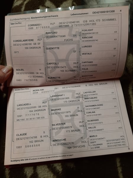 No urgent sale! We offer our direct Corrado I x Lascadell x Silvester x Marlo breeding mare. She is in foal to Kartal's Emerald (Tebbel). The expected foaling date is early May 2026. Born in 2008, height approx. 1.64 m, has produced larger offspring. Progeny can be viewed. She has always had premium or championship foals. The first picture is current as of 03.10.25. https://www.horsetelex.de/horses/pedigree/1595244/amina She is offered exclusively as a breeding mare. Please feel free to contact us with any questions.