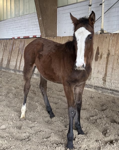 This modern, tall-legged filly is now available for sale. The attentive mare immediately catches the eye with her broad, white blaze. GK Theodora has excellent basic gaits and a very modern conformation. Thanks to her quality, she has all the prerequisites to develop into a successful sport horse in the future. Currently, the young lady is kept in a paddock with her three pasture friends in a loose box and is in excellent health. The filly is tall-legged, and her mother also possesses considerable size and stature (approximately 17.2 hh), so GK Theodora will also grow into a perfect riding horse size. Why is this good foal being sold at such an affordable price? In late October, my father unexpectedly passed away. As we are busy with three quite young children and both work full-time, managing a second farm (which I have now taken over) demands a workload that we cannot handle with just one employee. Therefore, we have decided to significantly reduce my father's horse herd, and this includes this foal as well. Please feel free to contact us with any questions – "final price inquiries" will remain unresponded. If you are genuinely interested in a very good foal, we invite you to arrange a visit. If everything fits, we can discuss a price afterwards. We look forward to hearing from you! www.gestuet-kriseby.de
