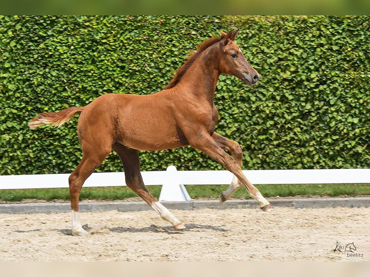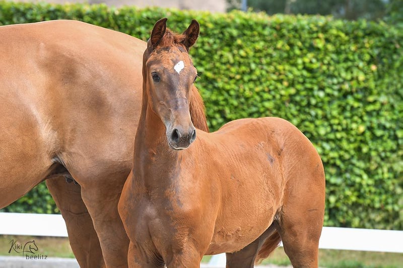 Das Stutfohlen ist über Kjento–Vivaldi super durchgezogen und als Holsteiner Dressurpferd eine absolute Seltenheit. Die Stute stammt aus dem renommierten Holsteiner Stutenstamm 474a, einem Stamm, der viele international erfolgreiche Springpferde hervorgebracht hat. Die Stute selbst ist eine ausgesprochen typvolle, hochbeinige Erscheinung mit genügend Substanz. Sie ist wirklich ein absoluter Hingucker. Ihr Interieur ist ebenso bemerkenswert – sie ist sehr nett, zugänglich, gelassen und dabei selbstbewusst. Immer präsent, zeigt sie sich stets von ihrer besten Seite. Sie ist ein sehr artiges Fohlen, das sich durch ihren außergewöhnlichen Typ hervorhebt. Besonders erwähnenswert ist, dass sie bei der Fohleneintragung hervorragende Noten erhalten hat und sich für das Fohlenchampionat qualifizieren konnte. Dafür muss der Schnitt über 8,0 liegen, was sie geschafft hat. Sie erreichte dabei den dritten Platz. Das zeigt, wie viel Potenzial in ihr steckt. Zudem wird sie wahrscheinlich ein großes Pferd, da ihre Mutter eine Größe von etwa 1,70 m erreicht. Melden Sie sich: sehr gern zeigen wir Ihnen dieses außerordentlich gute Fohlen vor Ort. Aus erfahrener, nachhaltiger Top-Aufzucht mit viel Platz und viel Weide, also mit besten Voraussetzungen für eine lange, gesunde Belastbarkeit. Optimal gepflegt, mit Mineralien versorgt, kerngesund, regelmäßig entwurmt und regelmäßig beim Schmied. Der Vater dieses Fohlens ist der zweifache Weltmeister der jungen Dressurpferde, Kjento, der sowohl den Titel der 6- als auch der 7-jährigen Weltmeister erringen konnte! Seine Grundgangarten sind von herausragender Qualität, wobei insbesondere sein kraftvoller Trab hervorzuheben ist (Note 10,0). Darüber hinaus überzeugt Kjento mit bemerkenswerter Rittigkeit und Arbeitsfreude. Durch die Anpaarung mit diesem Hengst erwarten wir, dass sein außergewöhnliches Talent sowie seine hohe Leistungsbereitschaft auf dieses Nachwuchspferd übergehen.