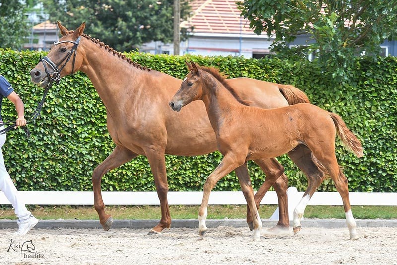 La potra está supercriada a través de Kjento-Vivaldi y es una absoluta rareza como caballo de doma Holsteiner. La yegua procede de la renombrada línea de yeguas Holstein 474a, una línea que ha producido muchos caballos de salto de éxito internacional. La yegua en sí es extremadamente tipica, de patas largas y con mucha sustancia. Es realmente una atracción. Su interior es igualmente notable - es muy agradable, accesible, relajada y al mismo tiempo segura de sí misma. Siempre presente, muestra su mejor cara. Es una potra muy educada que destaca por su excepcional tipo. Cabe destacar que obtuvo excelentes notas en el registro de potros y se clasificó para los campeonatos de potros. Para clasificarse, tenía que alcanzar una puntuación media superior a 8,0, y así fue. Logró el tercer puesto. Esto demuestra su potencial. También es probable que se convierta en un caballo alto, ya que su madre mide alrededor de 1,70 metros. Póngase en contacto con nosotros: estaremos encantados de mostrarle in situ este potro excepcionalmente bueno. Procede de una cría superior, experimentada y sostenible, con mucho espacio y pastos, es decir, con las mejores condiciones para una larga y sana resistencia. Cuidados óptimos, suministro de minerales, perfectamente sano, desparasitado con regularidad y visitado periódicamente por el herrador. El padre de este potro es el dos veces Campeón del Mundo de caballos jóvenes de doma clásica, Kjento, ¡que ganó los títulos de Campeón del Mundo de 6 y 7 años! Sus aires básicos son de una calidad excepcional, destacando su potente trote (puntuación 10,0). Kjento también impresiona por su gran facilidad para la monta y su disposición para el trabajo. Al cruzarlo con este semental, esperamos que su excepcional talento y su gran disposición al trabajo se transmitan a este joven caballo.
