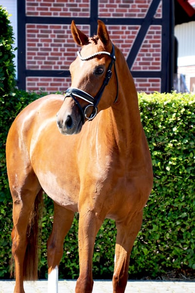 Magnifique jument de 4 ans par So Unique. Elle se montre absolument calme et facile à monter dans son travail quotidien. Un cheval à former et à apprécier.