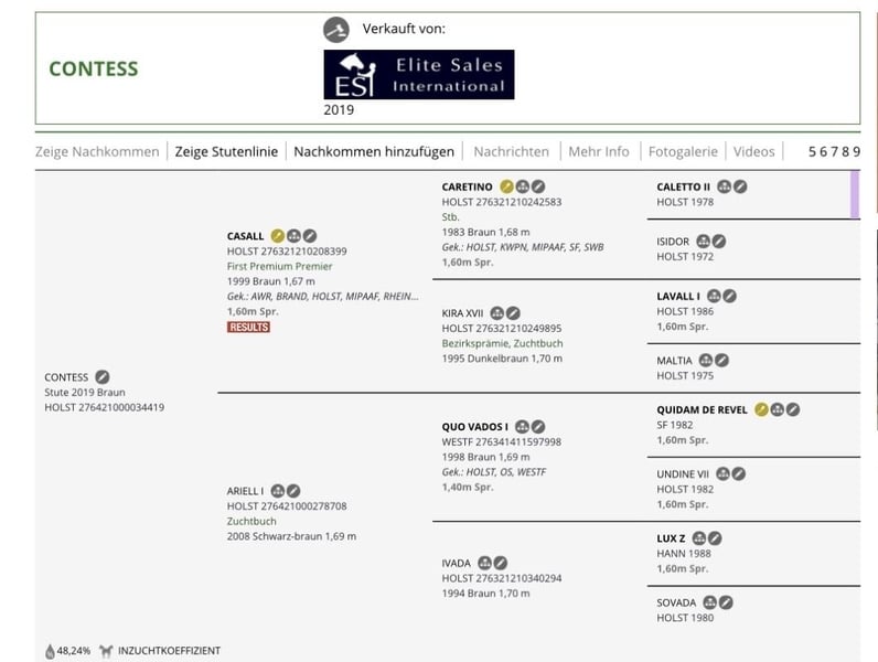 For sale is my breeding mare by Casall out of Quo Vados I x Lux Z. She has already foaled a very athletic, modern foal with ease, successfully accepting and foaling without issues. Several typy and sport-successful horses originate from her direct dam line (Holsteiner Stamm 5382). The mare has been ridden and has placements in Jumping Horse Class A. Due to an injury, she has not been active in sport since then. A veterinary examination from 2022 is available (diagnosis: OCD of the knee). Feel free to contact me via private message for more information and videos!