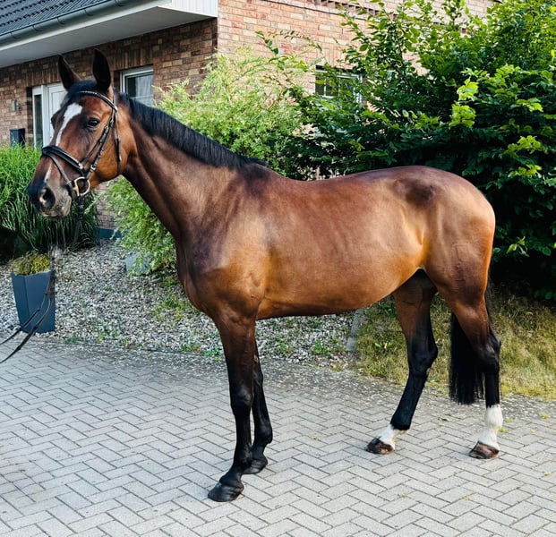For sale is a Holsteiner mare with potential. Name: Klara Breed: Holsteiner Pedigree: Sire Quibery – Dam by Colman Age: 8 years Height: 1.64 m Color: Bay Klara is a home-bred and unused beautiful mare. She is always well-behaved in handling, but at the same time has a sporty go and a lot of potential for further sports use. Due to the lack of a suitable rider, she has not yet been presented at competitions. However, she is already familiar with various venues, works reliably, and has the best prerequisites for successful development. She is loading-friendly and uncomplicated in handling, vaccinated and dewormed, and is barefoot. X-ray images are available with no findings. Klara is looking for a new home where her potential can be further developed. She is suitable for ambitious riders who are looking for a performance-ready, honest, and well-bred partner. Videos can be sent upon serious interest. Price is negotiable. Location: 23795 Negernbötel. For questions, please contact the number 0174/7391532.