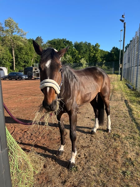 Nasza klacz Million Dollar / Casall, po 2 źrebakach, jest już od 1,5 roku w sporcie. W tym czasie wykazała się dużą chęcią do nauki i obecnie, w swojej drugiej sezonie jako koń skokowy z młodą amazonką (amator), osiągnęła solidny poziom M i wielokrotnie zajmowała dobre miejsca w M. Już brała udział w różnych zawodach – w tym międzynarodowych. Z powodu studiów / pobytu za granicą szukamy jeźdźca – chętnie również amatora – z doświadczeniem w pracy z młodymi końmi, który będzie ją dalej rozwijał. Klacz jest typowa, duża i spokojna w codziennym obcowaniu, a także podczas transportu i u kowala. Regularnie również wychodzi w teren.