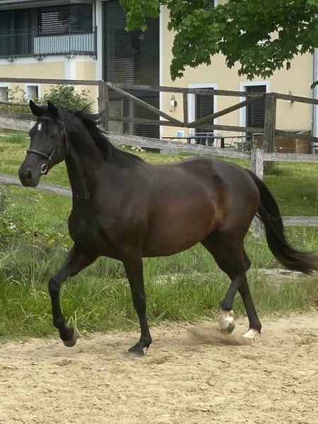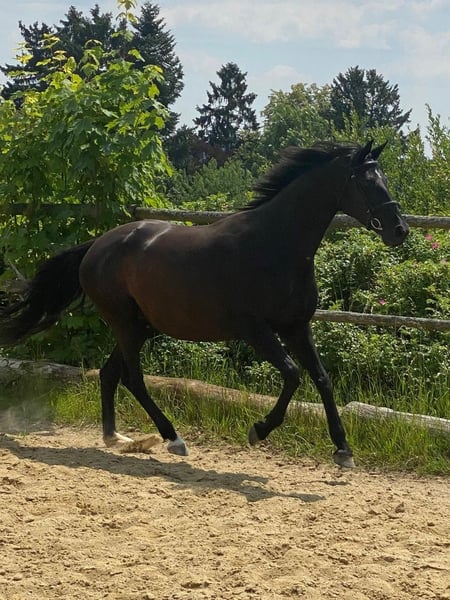 Very sweet and good-natured black mare with full Holsteiner breeding papers. She has given birth to a very nice black foal with us. Unfortunately, she is not fully load-bearing due to a condition called "Durchtrittigkeit" (overreaching). Therefore, she is ideal as a companion and leisure horse.