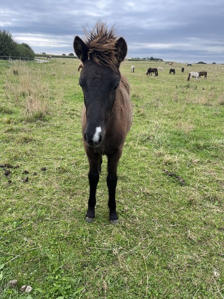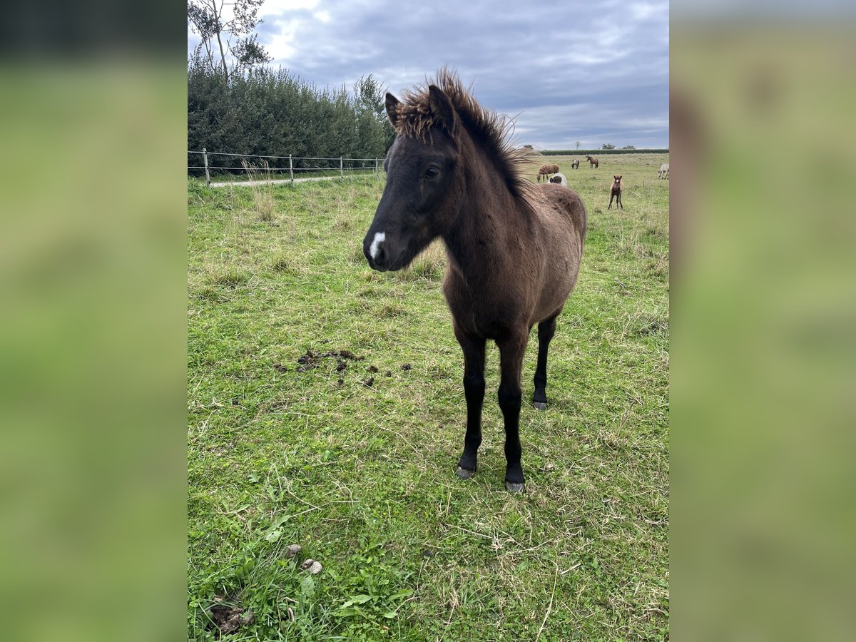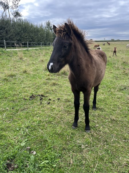 Erlingur ist ein großes, gut entwickeltes Hengstfohlen in der besonderen Farbe Leuchtrappe (Rappisabell) und mit einer niedlichen Schnippe. Er ist am 9.5.25 geboren. Er ist Naturtölter und zeigt diesen locker auf der Weide, kann aber auch schön traben. Vermutlich ist er vier- oder viereinhalbgängig veranlagt, denn er zeigt auch eine schöne Galoppade und ich habe bisher keinen Pass bei ihm gesehen. Es gibt zu ihm bereits sechs ältere Vollgeschwister, die auch teilweise schon unter dem Sattel sind, so dass wir über diese Anpaarung eine sichere Aussage treffen können. Alle Geschwister wurden überdurchschnittlich groß, zwischen 141 cm und 146 cm, so dass wir dies auch bei Erlingur erwarten, zumal er jetzt ebenfalls bereits auffallend groß ist. Er selbst ist wie seine Geschwister ein unkompliziertes Fohlen, das sich interessiert zeigt und nicht ängstlich ist. Wir entwurmen unsere Fohlen sehr regelmäßig, machen die Hufe und weiden sie von Weide zu Weide um, was er alles super mitmacht, aber ansonsten lassen wir unsere Fohlen in Ruhe und betüddeln sie nicht. Dabei ist er gelassen und kommt auch auf der Weide an um zu gucken, wer da ist. Er verspricht ein unkompliziertes Reitpferd mit ganz viel Tölt und einem freundlichen Charakter zu werden. Seine Geschwister waren sehr (!) einfach einzureiten. Seine Mutter ist ein absolutes Verlasspferd und Tochter des WM- und Elitehengstes Ómi fran Stav, der sehr viele schöne und extrem einfache Naturtölter hervorgebracht hat. Sein Vater ist der Hengst Örn Þór frá Syðra-Velli, der FIZO geprüft ist und den ich viele Jahre erfolgreich im Viergangpreis und in der T2 vorgestellt habe. Erlingur kann ab Mitte/Ende November ausziehen oder noch über Winter in seiner Herde bleiben und dann in eine Aufzuchtherde umziehen.