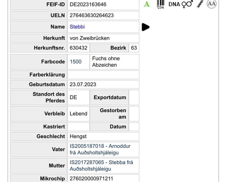 Zum Verkauf steht ein Fohlen/ Absetzter. Das Endmaß wird ungefähr bei 1,40m +- liegen. Er wurde bei uns an der Fohlenbeurteilung gezeigt und konnte hierbei super abschneiden. Exterieur: 8,00 Interieur: 8,00 Gänge: 7,90 Gesamt: 9,95 Richterspruch: Lauffreudiges Hengsfionfeh, fünfgangveranlagt, mit gleich viel Tölt und Trab bei mittlerer Tempofähigkeit und weiten Bewegungen. Er wird nächsten Monat abgesetzt. Gerne bei uns melden.