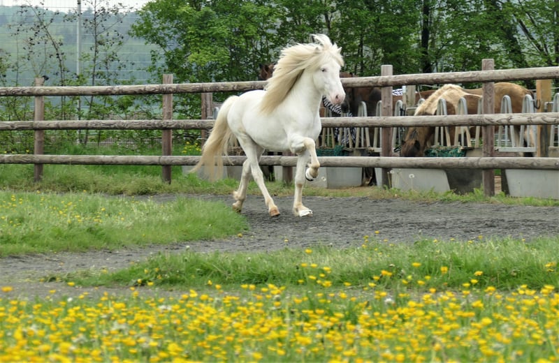 Dieser junge Shooting-Star steht Fremdstuten zur Verfügung! Fannar ist ein 2020 geborener Sohn unseres W8-Vererbers mit Elite-Körung Pegasus vom Recherbusch. Auch er trägt das W8 White Spotting Gen, bei ihm in der besonderen Kombi mit dem Spash-Gen. Fannar ist einer sogenannter Maximum-White, ein riesiger weißer Scheck-Fleck sozusagen. Er trägt kein Creme Gen. Die Farbe ist jedoch nur das i-Tüpfelchen auf diesem jungen Mann: Fannar zeigt viel lockeren Naturtölt und sehr gute Rennpassphasen. Der Galopp ist energetisch und mit gutem Bergauf in der Bewegung. Trab zeigt Fannar federnd und elastisch mit viel Tempofähigkeit. Fannar ist mittlerweile gut geritten und begeistert uns täglich- er bringt so viel natürliches Bewegungspotenzial bei immer angenehmer Mitarbeit mit, es ist eine Freude mit ihm zu Arbeiten. Am Boden ist er einerseits sehr gelassen und unaufgeregt, andererseit reagiert er flink und bewegungsfreudig auf treibende Hilfen. Fannar bringt eine spannende Abstammung mit: Väterlicherseits geht er auf den mehrmaligen WM-Teilnehmer Svartur vom Hochwald (FIZO 8.09) und auf den Spitzenvererber und Ehrenpreisträger für Nachkommen Keilir frá Miðsitju (FIZO 8.63) zurück. Seine Mutter Freisting von Kastali ist selbst FIZO-Elite (Exterieur: 8,16 - Reiteigenschaften 8,12 - Gesamt 8,14) vorgestellt und stammt von dem Pass-Talent Djáknar frá Hvammi (FIZO 8.46, Erster Preis für Nachkommen) ab. Freisting ist eine lauffreudige,sehr freundliche Stute: Aus schnellem Rennpass kann man sie über wenige Meter in gelassenen Schritt am langen Zügel durchparieren. Ihre fünf Gangarten sind gleichmäßig verteilt, sicher und mit weiten Bewegungen. Fohlen FEIF Beurteilung 2020: Exterieur: 8,1 - Interieur: 8,3 - Gang: 8,2 - Gesamt: 8,19 Richtspruch: "Gut entwickeltes hochaufgerichtetes langbeiniges ausdrucksstarkes Fünfgang-Hengstfohlen mit sehr guten feinen Reaktionen, zeigte sehr guten Tölt mit viel Fluss und insgesamt sehr guter Gangverteilung und mit guter Bewegung."