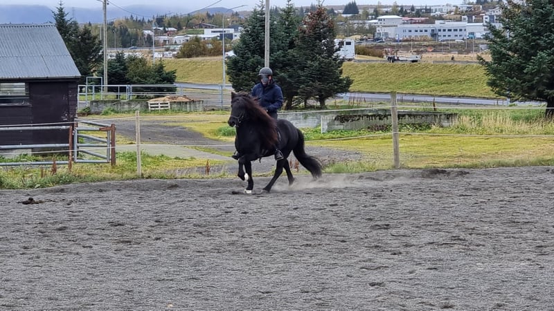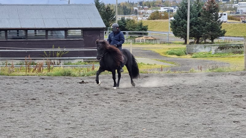 V: Blear frá Torfunesi M: Djásn frá Vatnsleysu Jörvar was imported directly from Iceland by me. He is a very attentive horse that still needs a confident handler on the ground whom he can trust. Under saddle, he is lively and spirited in the Icelandic style. His tölt is clearly rhythmical. He has distinctly separated gaits that are always readily available. He is comfortable both riding alone and in a group, and he simply brings joy whether in the arena or on the trail. I have never had any issues with him at the farrier or when loading him. Jörvar is especially suitable for ambitious riders who also wish to compete in sport horse disciplines. He requires a skilled rider who can provide him with security both on the ground and in the saddle, so he is not suitable for beginners. However, for an experienced rider, he is a true delight, as he brings his full Icelandic charm and enthusiasm to every ride, captivating and inspiring. Jörvar is regularly dewormed and vaccinated. He can be tried out under saddle by serious interested parties.
