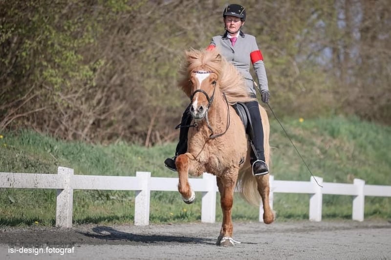 Stapi ist ein sehr großer und imposanter viergängiger Falbwallach, der vor allem mit seinem sagenhaften Tölt beeindruckt. Er war in der T2 für die Leistungsklasse 1 qualifiziert und erreichte in dieser Prüfung mehrfach über 7 Punkte als Gesamtnote, wobei er häufig für beliebiges Tempo und Zügel überstreichen 7,5 Punkte bekam. Sein Tölt ist wirklich der absolute Wahnsinn und man kann auch 10 Runden Zügel überstreichen reiten, wenn mann will! Auch starkes Tempo Tölt ist kein Thema für ihn. Stapi hat aber auch gute, sichere und ausdrucksstarke Grundgangarten, war aber in der V2 etwas weniger erfolgreich, da der Schritt nicht immer gut abrufbar war. Derzeit wird er von einer 15j. Jugendlichen geritten, die sehr an seiner Gelassenheit gearbeitet hat, was kürzlich zu einer ersten 6,5 für Schritt geführt hat. Guten Ergebnissen im Viergang steht also auch nichts mehr im Weg. Sie war auch bereits bei insgesamt zwei Starts in der T4 einmal siegreich und einmal zweite. Stapi ist ein etwas spezielles Pferd, was sich darin zeigt, dass er im Umgang eher ein skeptisches Pferd ist, was sich nicht immer von jedem auf dem Paddock fangen lassen will und keine schnellen Bewegungen auf Kopfhöhe mag. Auf seine Reiterin Hanna kommt er aber immer freudig zugelaufen. Auch ist er unter dem Sattel ein temperamentvolles Pferd, das einen gelassenen Reiter benötigt, der Stapis riesen Bewegungen mit dem dabei entstehenden Tempo toll findet und nicht immer auf der Bremse steht. Er ist dabei zu 100 % klar im Kopf, macht im Gelände richtig Spaß und meistert auch Vereinsausritte mit 20 anderen Pferden souverän. Nur töltet er nebenher, wenn die anderen schon galoppieren … (macht richtig Laune!) Auch auf dem Turnier liefert er immer ab, er findet sich sofort auf neuen Plätzen super zurecht und man kann auch direkt in die Prüfung starten, ohne ihm vorher die Bahn gezeigt haben zu müssen, da ist er ein richtiger Routinier. Stapi kam vor vielen Jahren aus Island und ist ein Sohn des legendären Ómur frá Kvistum, der viele sehr gute Sport- und Zuchtpferde hervorgebracht hat. Er wird bei uns ganzjährig robust gehalten und ist absolut ekzemfrei. Er wird nie aufgestallt oder eingedeckt. Ich möchte meinen Bestand verkleinern und daher gebe ich Stapi zu diesem sehr fairen Preis ab. Ich wünsche mir für ihn einen einfühlsamen Reiter, der ihn mit seinen Eigenheiten nimmt, wie er ist oder besser noch, diese sogar gut findet. Auch ist er natürlich ein interessantes Pferd für einen talentierten Jugendlichen, der mit Stapi Turnierluft schnuppern und dabei auch noch erfolgreich durchstarten möchte. Seine jetzige Reiterin hat leider schon ein eigenes gutes Pferd, daher suche ich für Stapi den passenden Reiter.