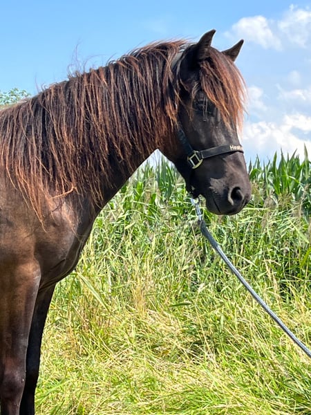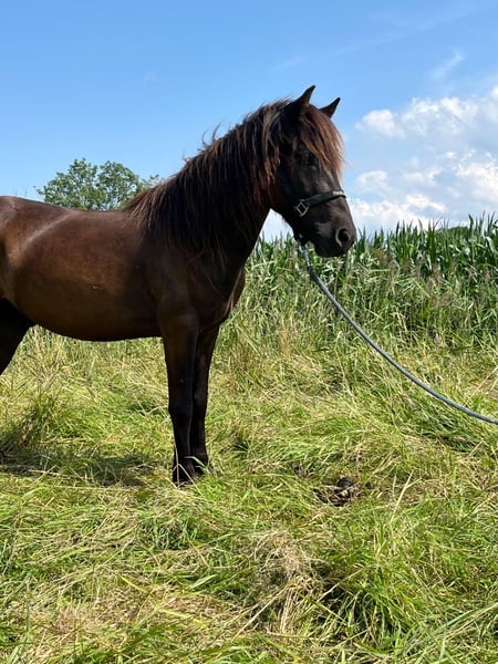 Blómi von Eldhólar (DE2021122997) V: Skarði vom Vindstaðir (Zuchtweltmeister, 8,22 ges.) M: Blíða von Eldhólar MV: Þórarinn frá Oddhóli (8,17 ges., u.a. Bis 6,67 in F1) Blómi ist ein absolut freundlicher kleiner Fünfgangwallach, der einem das Herz aufgehen lässt! Er ist in jeder Lebenslage für seine vier Jahre sehr cool und gelassen und bildet einen Ruhepol in seiner Junghengstherde. Er zeigt alle 5 Gänge mit sehr guter Qualität, damit sieht man später auf Turnieren bestimmt auch nicht schlecht aus! Blómi kann alles, was man mit vier Jahren können muss (Aufhalftern, Führen, Hufschmied, Tierarzt, etc.) Wenn er ausgebildet ist, wird er bestimmt das perfekte Kinder-/Familienpferd, er ist einfach so brav und liebt es Menschen um sich zu haben, die sich mit ihm beschäftigen, ohne dabei aufdringlich zu werden! Da er eher etwas kleiner ist (ca. 1,33 m) kommt er vermutlich eher für zierliche Erwachsene oder Kinder/Jugendliche in Frage. Er ist aber mit seinen 4 Jahren natürlich auch noch nicht voll entwickelt! Aktuell steht er noch in einer Junghengstherde in der Nähe von Cuxhaven und kann nach Absprache besichtigt werden. Auf Wunsch besteht auch die Möglichkeit, dass ich Blómi noch ausbilde und auf seine neue anstehende Aufgabe perfekt vorbereite! Ich bin gelernte Pferdewirtin Spezialreitweisen und IPZV Trainer C, arbeite seit langer Zeit als Islandpferde Trainerin und habe mich auf die Jungpferdearbeit spezialisiert. Leider hatte Blómi im Frühjahr eine Verletzung durch ein stumpfes Trauma an einem Auge, er kann sehen, aber es ist nicht 100% klar, wie es in Zukunft aussehen wird. Es ist aber tierärztlich bestätigt, dass normal er nutzbar sein wird, dem Start ins Reitpferdeleben steht also nichts im Weg. Deswegen wird er aber weit unter Wert abgegeben!! Tierärztlicher Bericht zum Befund des Auges liegt vor. Bei Fragen etc einfach gerne eine PN schreiben! Es handelt sich hier um einen Privatverkauf!