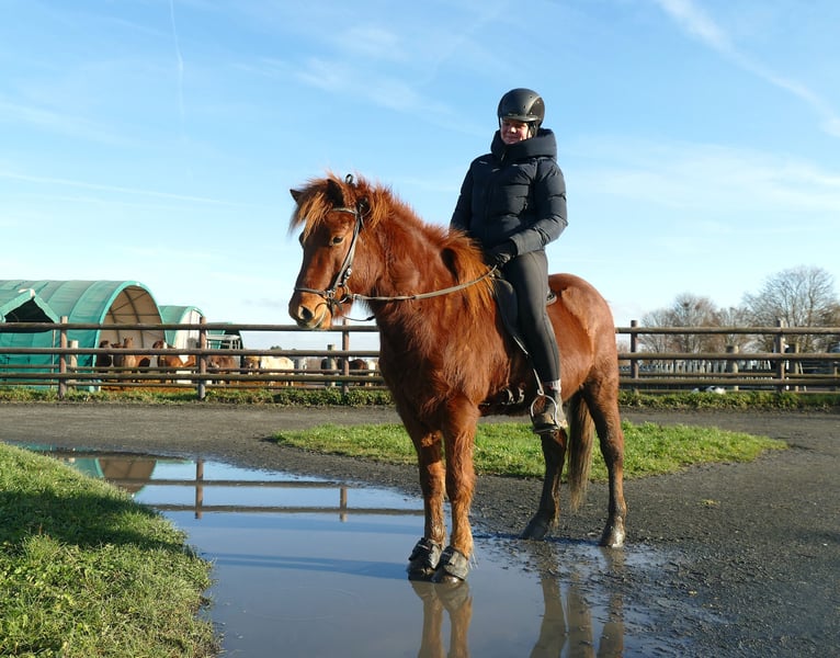 Red Diamond Neisti is a promising young Icelandic gelding who already demonstrates impressive potential through his age-appropriate, professional training. As an elegant four-gait horse, he impresses with light-footed, rhythmical movements and a particularly beautiful, balanced canter—easily and effortlessly responsive, even on small circles. He is familiar with groundwork, lunging, and riding both indoors and outdoors. Neisti has already experienced a variety of situations and works with focus and reliability. He is sensitive to aids, offering his rider a refined, harmonious riding experience. Thanks to his good rideability and natural willingness to perform, he is suitable both as a talented competition horse and as an uncomplicated, motivated partner for leisure riding. He is well-behaved in handling, well-socialized within our gelding herd, and relaxed when being trimmed by the farrier. A young gelding with a bright future—attentive, elegant, and ready for new challenges. Neisti is looking for a person who wants to further develop his potential and grow together with him. Currently, he is suitable for a confident, relaxed teenager or an ambitious adult—not an absolute beginner’s horse, but also not particularly demanding.