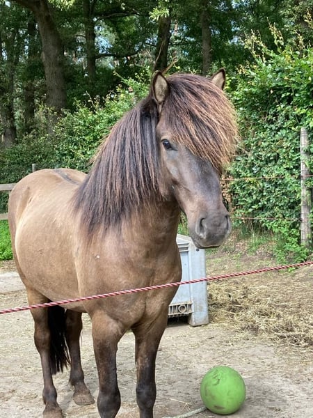 Direct van fokker (en trainer): Dúx van de Lichtenbelt (v: Djákni frá Flagbjarnarholti – 8,25) is een ontzettend lieve meewerkende 6-jarige ruin, goed ingereden en klaar om met zijn forever baasje nieuwe avonturen te beleven! Hij heeft een rustig, stabiel en betrouwbaar karakter in alle facetten. Vind hij een keer iets spannend, dan zal hij eerder gaan stilstaan dan ervoor wegvluchten. Dúx is een 5-ganger met een mooie gedragen basishouding. Hij tölt heel makkelijk en training in de bak doet hij ontzettend braaf (van zijgangen tot eenvoudige galop wissel!). Ook buitenrijden vindt hij uiteraard heerlijk. Hij geeft makkelijk telgang op verzoek maar dit is verder niet getraind. Dúx is al een behoorlijk compleet rijpaard, maar uiteraard is hij pas 6 jaar en zal hij zich op diverse vlakken nog verder kunnen ontwikkelen. Vorig jaar is hij zadelmak gemaakt met de basis van het rijden en dit jaar is hij goed doorgereden, waarbij we met hele kleine stapjes hebben gewerkt en hij letterlijk elke training direct verbetering liet zien; hij pakt alles echt supersnel en super braaf op. Een heerlijk paard om te rijden en een heerlijk paard om mee te werken! In de kudde staat hij bij ons met alleen merries. Hij mag met ‘de grote baas’ mee-eten maar zelf is hij rustig en absoluut geen baasje, eerder een beetje achterop. Hij is wel beschermend naar “zijn” merries. Hij heeft in korte tijd al super veel geleerd. We zoeken een baasje die in rustig tempo lekker verder met hem aan de slag gaat; een gouden duo die ontzettend van en met elkaar zullen gaan genieten! · Geboren eind mei 2019 (nu 6 jaar) · Wildkleur Zwart · Ruin · Stokmaat ca. 140-142cm · 5-ganger · Geen eczeem en geen gevoeligheid voor jeuk · Reageert goed op de hulpen, goede rem (ook op zit en stem), gangen zijn goed te scheiden · Heel braaf in de omgang, op de trailer en bij de hoefsmid · Verkeersmak, kan samen en alleen naar buiten · Qua karakter rustig en stabiel · Staat bij ons niet op ijzers · Volledig gevaccineerd en naar de tandarts geweest · 14.000-16.000 Wordt Dúx jouw nieuwe droompaard? · Ruiter maximaal 70kg · Stallingssysteem met dagelijks veel bewegingsvrijheid