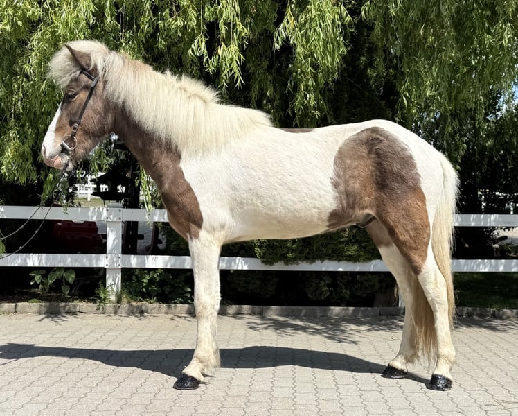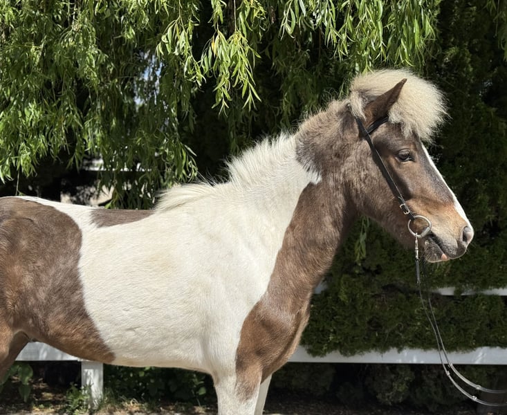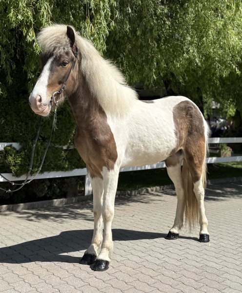Froður vom Singergut Gelding, currently 1.43m Color: Brown wind-colored pinto *2020 born in Austria eczema-free, healthy✅ shod, dewormed, vaccinated✅ currently four-gaited ridden A true gem is looking for his perfect person! This exceptionally handsome gelding was born in Austria in 2020. He impresses not only with his rare special color (brown wind-colored pinto) but also with his remarkable gait quality and his balanced, friendly character. Naturally polite in handling, curious, fearless, and people-oriented – a true charmer who is ready to start his further training. Particularly noteworthy is his flowing movement, which combines a lot of tölt potential with clear structure & quality in all basic gaits. This gelding has everything it takes to develop into a promising sport horse for youth with further training – he is perfectly suited for children, teenagers, or light adults who value an honest, reliable, and willing horse. Fróður is the all-rounder with a special color focus – this gelding will capture hearts. ❤️ His price is subject to increase with further training. He can be visited and tried out with us in A-5221 Lochen am See by appointment.
