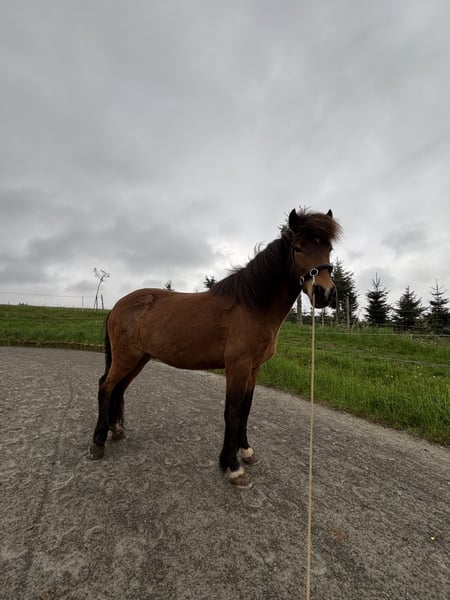 Aron vom Dreisbach DE2019163138 15.06.2019 M: Nótt-Stjarna vom Ökoland Rose V: Óðinn vom Habichtswald - Fünfgänger - schmiede- und verladefromm - regelmäßig geimpft und entwurmt - regelmäßig Pysio + Osteo + Zahnarzt (keine Auffälligkeiten) - 1,44m - Verkehrssicher - Beschlagen Aron ist ein außerordentlich motivierter, hübscher und selbstbewusster junger Wallach mit guter Gangtrennung und mittlerem bis hohem Temperament. Er ist elegant und sportlich gebaut. Er wurde schonend angeritten. Er reagiert sensibel auf Sitz und Hilfen, brauch aber aufgrund seines Ausbildungsstand und Selbstbewusstsein mehr Kontinuität. Aron kennt Bodenarbeit wie Longieren, Doppellonge, Spaziergänge sowie Handpferdereiten. Außerdem kennt er die Halle, Ovalbahn sowie das Gelände alleine oder in einer Gruppe. Im Gelände sowie auch allgemein ist er mutig und nicht schreckhaft. Er ist fünfgängig, die Grundgangarten sind taktklar und bequem zu sitzen, Tölt und Pass sind noch nicht ausgebildet. Er hat jedoch viel Tölt und zeigt diesen auch in den Übergängen. Galopp auf dem Zirkel möglich. In der Herde hat er einen mittleren Rang und spielt mit allen viel und sehr gerne. Er steht mometan in einem Offenstall in einer reinen Wallachgruppe. Er verträgt Heu sowie Heulage. Aufgrund von Alter und Ausbildungsstand nicht für Anfänger geeignet. Sein Zubehör kann gerne mit erworben werden, wenn gewünscht. Melde dich gerne bei mir und wir machen einen Termin zum Probereiten / Kennenlernen aus. Platz vor Preis.