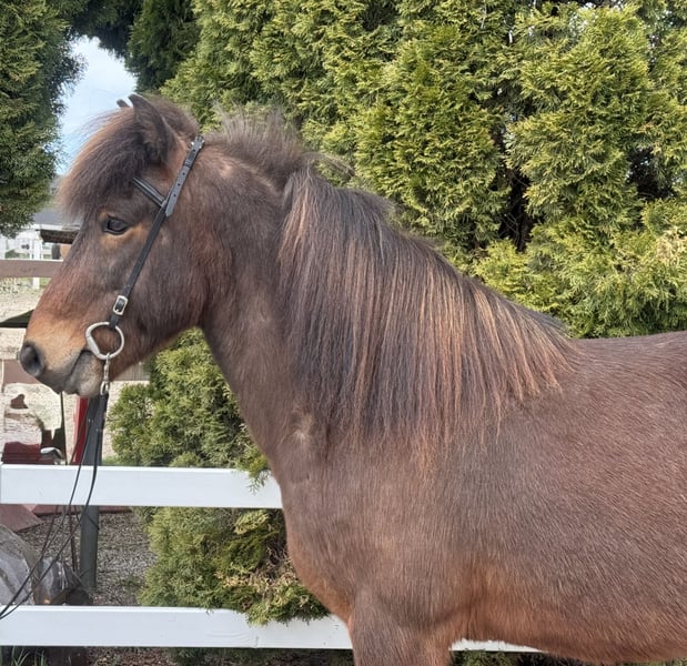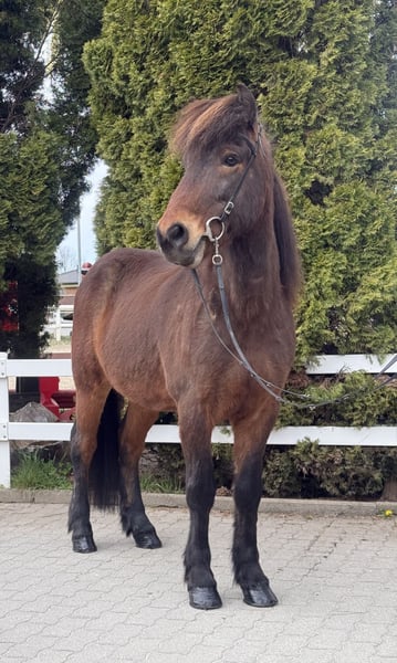 Mímir vom Barghof Wallach, 1,44m groß *2018 in Deutschland Brauner ohne Abzeichen viergängig geritten direkt vom Züchter✅ gesund, beschlagen, ekzemfrei✅ V: Maríus vom Blocksberg 2 VV: Herjólfur frá Ragnheiðarstöðum M: Litfríð vom Barghof MV: Stormur von Faxaból Wie beschreibt man am besten ein ziemlich tolles Pferd, ohne dass es übertrieben klingt?! 😅 Mímir ist einfach ein Traum, charakterlich, gangtechnisch, als auch optisch. Er lässt wirklich keine Wünsche offen. Mit seinen 1,44m zählt er zu den Größeren seiner Rasse und deckt somit alle Reiter sehr gut ab. Viergängig geritten zeigt er sehr viel Talent und ansprechende Bewegung im Tölt. Dabei ist Tölt so einfach zu reiten, dass auch weniger erfahrene Reiter, diesen abrufen können. Trab ist sicher, taktklar und von guter Qualität. Galopp ist gut gesprungen, schön zu sitzen und in allen Tempi zu reiten. Mit einem sanften „Hooo“ lässt er sich bremsen oder gar ganz zum Halt durchparieren. Er zeigt ein großes Talent auch für Dressurlektionen und -Prüfungen. Im Gelände ist er die sichere Bank und lässt sich weder von Straßenverkehr, Kühen, Fahrrädern oder neuen Situationen beeindrucken. Wir sehen ihn als einen absoluten Allrounder für jung und alt, für erfahren und weniger erfahrene, für Freizeit und Sport. Mímir ist ein Pferd, welches man einfach im Stall haben sollte - so finden wir. 🤗 Aufsteigen und sofort wohlfühlen ist bei ihm das Motto!