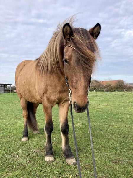 Stjarna Dís ist eine hübsche 9j. Viergangstute (Stm. ca. 138 cm), die aufgrund ihres tollen Charakters und ihrer schönen und unkomplizierten Reiteigenschaften das optimale Freizeitpferd für Familien, Wiedereinsteiger, Islandpferdeneulinge und sogar Kinder mit etwas Reiterfahrung ist. Ihre vier Gangarten sind absolut klar voneinander getrennt und ganz sicher abrufbar. Sie hat einen guten Schritt, einen sehr bequemen Trab, der in unterschiedlichen Tempi zu reiten ist und einen gut gesprungenen, weichen Galopp. Ihr Tölt ist sicher, immer taktklar und ganz einfach auch auf langen Strecken zu reiten. Mit ihren einfachen Gängen macht sie es einem Reiter, der noch nicht so viel Erfahrung mit Gangpferden hat, wirklich leicht. Dabei hat sie ein mittleres Temperament: sie lässt sich leicht regulieren, ist aber motiviert bei der Arbeit und nicht faul. Sie ist angenehm weich in der Hand und reagiert gut auf des Reiters Einwirkung und hat in allen Gängen eine schöne Form. Im Gelände ist sie eine sichere Bank: nervenstark im Straßenverkehr und unerschrocken draußen lässt sie sich allein und in der Gruppe überall sicher reiten. Bei der Platzarbeit macht sie ebenfalls eine gute Figur und bringt Talent für das dressurmäßige Reiten mit. Sie ist kontinental gezogen, ekzemfrei, gesund und wird im Offenstall gehalten. Also auch in dieser Hinsicht ist sie völlig unkompliziert. Wer dieses Pferd als Freundin fürs Leben hat, kann sich wirklich glücklich schätzen.