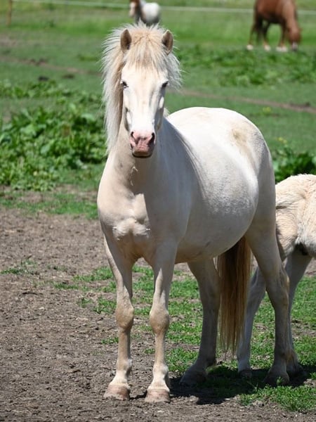 For Sale: Icelandic Mare – Born in 2016, Perlino, 14.2 hh, Austrian-bred Pregnant by the DEM Thór Steinn frá Kjartansstödum (Fizo, 8.42 with a 9.5 for Tölt!!). This stunning Icelandic mare is a true asset for any rider or breeder. Born in 2016, she impresses with her radiant appearance (unicorn-like look with blue eyes) and friendly temperament. Her striking perlino coat color makes her a real eye-catcher. She is already saddle-trained and has produced four beautiful foals. With further training, she is suitable as a family horse for leisure riding – this Icelandic mare offers versatile use. If you are interested or have any questions, please feel free to contact me. Viewing by appointment is possible.