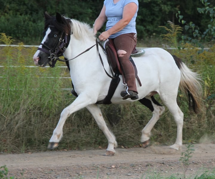 Genesis wird wegen immer wieder auftretendem akutem Zeitmangel und dadurch Reduktion des Pferdebestandes günstig in erfahrene Hände abgegeben. Sie ist seit mitte 2024 unter dem Sattel, leider mit immer wieder aus Zeitmangel bedingten längeren Standpausen. Daher nur gut angeritten und benötigt noch weitere Ausbildung. Genesis ist und wird kein Anfängerpferd und ist auch nicht für ängstliche Reiter geeignet. Sie bringt ein zeitweilig etwas spritziges Temperament mit, meistens wirkt sie ausgeglichen kann aber Situationsbedingt zeigen das mehr in ihr steckt. Fährt sie ihr Temperament hoch wird sie fleißiger , ausdrucksstarker und guckig. Daher nur für erfahrene Reiter die ruhig bleiben und auch mit etwas mehr Temperament zurecht kommen. Sie ist bis dato Unartenfrei und routiniert brav im Händling, Verladefromm und auch Schmiedefromm. Aktuell leider nicht ganz Geländesicher was sich ggf. dem ständigen mal geritten und mal nicht geritten werden geschuldet sein kann. Genesis ist Fünfgängig wird derzeit eigentlich nur viergängig geritten. Ihr Schritt ist immer Freilaufend und unter dem Sattel taktklar ohne Passverschiebung. Freilaufend zeigt sie meistens Trab und auch unter dem Sattel ist dieser einfach abzurufen. Zeitweilig läuft sie auch auf der Weide Tölt wobei sie aber den Trab deutlich bevorzugt. Unter dem Sattel lässt sie sich einfach antölten und benötigt nur noch gelegentlich Korrekturen des Taktes oder Tempos. Auf der Weide zeigt sie einen guten Galopp mit Bergauftendenz. Unter dem Reiter wurde sie noch nicht viel im Galopp gearbeitet und benötigt dort noch mehr Training. Ihr fehlt es im Galopp mit Reiter noch an Kraft, Biegungsfähigkeit und Balance daher kann es passieren das sie im Kreuzgalopp anspringt oder auch auf flachen Wegstrecken nach einigen Sprüngen in den Pass fällt. Bergauf lässt sie sich einfacher Galoppieren und springt da auch sehr schön. Probeweise wurde sie mal als sie in den Pass gefallen ist angetrieben und beschleunigt dann auch im Pass, sie kennt die Hilfen zum legen nicht und wird auch bis dato normalerweise nicht im Pass geritten. Es wurde mit ihre angefangen seitwärtstreibene Hilfen zu üben wie auch Rückwärtsrichten. Genesis ist 2013 geboren seitdem gesundheitlich Unauffällig, geimpft, entwurmt, Hufe gepflegt. Sie bringt volle Papiere mit und wurde in den letzten Jahren auch in der Zucht eingesetzt. mit 7,9 für Gang und Interieur ins Stutbuch 1 eingetragen. Ihre Fohlen überzeugten mit guten Gängen, Farbe und Charakter. Ihr erster Nachkomme ist schon länger unter dem Sattel und überzeugt mit Gang und Rittigkeit. Die meisten ihrer Nachkommen sind größer wie sie selbst geworden auch mit kleineren Hengsten. Genesis kann jederzeit noch einmal als Zuchtstute eingesetzt werden sofern man dies möchte. Bei Zuchteinsatz ist sie ein Farbgarant da sie getestet reinerbig Schwarz ist und dadurch selbst mit einem Fuchshengst niemals Fuchsbasierte Fohlen fallen können. Zusätzlich kann sie zu jeweils 50 % das Tobiano- und Splash- Gen vererben. Das Video ist das aktuelleste was ich habe, sie läuft da mit Kunststoffbeschlag der fast gleichzusetzen wie Barhuf ist. Sie hatte aber auch schon normale Hufeisen drauf und steht brav beim Schmied. Aktuell ist sie durch die immer wieder auftretenden Standpausen etwas zu dick und würde sich daher sehr über eine kontinuierliche Aufgabe als Reitpferd oder nochmal Zuchtstute freuen. Gerne kann sie angeschaut und vorgeritten werden. Probereiten gegen Gebühr die bei Kauf auf den Kaufpreis angerechnet wird möglich. Auf Wunsch kann der Käufer eine Aku veranlassen. Auf Wunsch und gegen Kostenerstattung Bedeckung nach Absprache. Der aktuelle Preis ist ein absoluter Festpreis und nur gültig bei Abholung und Zahlung bis spätestens Ende März 2026. Sollte sie dannach noch da sein werde ich mit ihr andere Wege gehen was auch bedeutet das sie so günstig sicher nicht mehr zu haben sein wird.