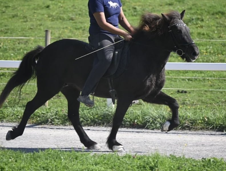 Svala is a 138 cm tall four-gaited mare with a strong Tölt. She has successfully competed in Riding Badge 1 and 2 with us. Currently, Svala is part of a mixed herd and is very easy to handle both in the herd and in everyday interactions. Her Tölt is consistently smooth and rhythmic. She has already had the opportunity to experience some competition atmosphere at our local dressage event in both four-gait and Tölt. She has also been ridden in advanced riding lessons with experienced riders. Due to her occasionally strong personality, she is not exclusively suitable for beginners. A few years ago, she suffered a fracture of the hind pastern, which has fully healed and does not limit her in any way.