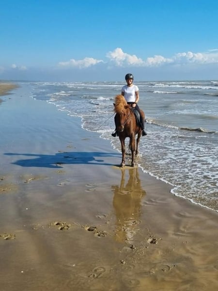 AT2009220959 Leiding is 16 jaar oud en een echte parel. Een plezier voor elke fijne ruiter en een absolute leermeester voor kinderen en jongeren. Ze is zeer gevoelig in de zin van lichte rijbaarheid, heel fijn, reageert attent op zit, ademhaling en stem. Ondanks haar gevoelige karakter is ze echter absoluut bombproof. Leiding heeft nergens angst voor en schrikt nergens van, ook niet van verkeer, tractoren, sneeuwploegen of treinen – alles geen probleem. Ze loopt altijd en overal doelgericht vooruit en is een rots in de branding. Zowel alleen als in een groep. Wat gangverdeling betreft, is ze een zeer evenwichtig vijfgangpaard. Ze is heel gemakkelijk te rijden in de tölt, heeft een veilige draf en een comfortabele stap. Galop is meer gelopen, maar in het terrein en vooral bergop is ze goed te rijden. Leiding beschikt over een uiterst betrouwbare sprintpassage, die ze graag en ontspannen in de tölt uitvoert. Bij volwassen ruiters gaat ze snel en ijverig vooruit, kinderen behandelt ze met bijzondere voorzichtigheid en let ze goed op. Ook in de omgang is ze absoluut kindvriendelijk. Ze laat zich geduldig leiden, poetsen, hoeven uitkrabben, manen borstelen – het maakt haar niets uit als de borstel op de grond valt of als het kind naast haar met de stoel omvalt. Dressuurmatig is ze goed opgeleid en een echte leermeester voor leerlingen: op kleinste hulp reageert ze met schouder binnen, kruispas binnen. Ze kan traversalen in stap en tölt, schouderbinnen ook in draf. Helaas heeft ze een hooistofallergie en heeft ze een stal nodig die geschikt is voor allergieën. Met gestoomd/nat hooi of hooilage/gisthooi is ze volledig klachtenvrij. Omdat ze zeer stevige, compacte en vrij nauwe hoeven heeft, krijgt ze heel snel hoefstraalziekte. Goede, regelmatige verzorging, onderhoud en droge huisvesting zijn daarom noodzakelijk. Daarentegen laat ze zich uitstekend barhuf rijden: stap, draf, tölt en sprintpassage vormen geen probleem op blote hoeven, alleen bij galop op harde ondergrond vindt ze het wat moeilijker zonder hoefbeslag. Als er een perfect match ontstaat – een familie die onze parel net zo liefheeft en waardeert als wij – met optimale huisvestingsomstandigheden, kunnen we een verkoop overwegen. Meer informatie, foto’s en video’s op aanvraag. Een bezichtiging is altijd mogelijk.