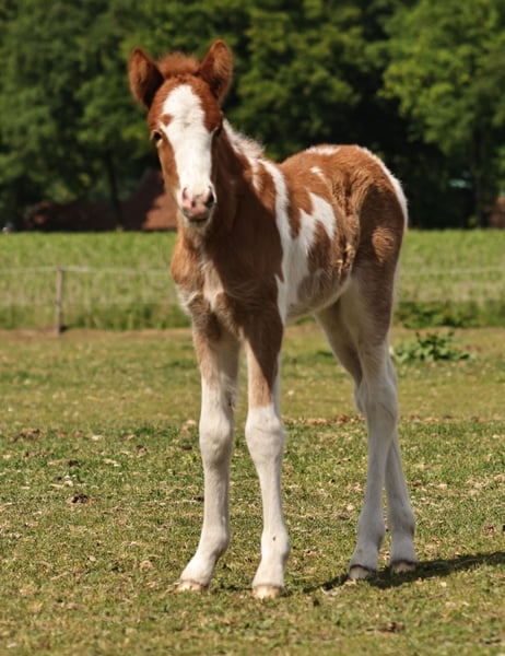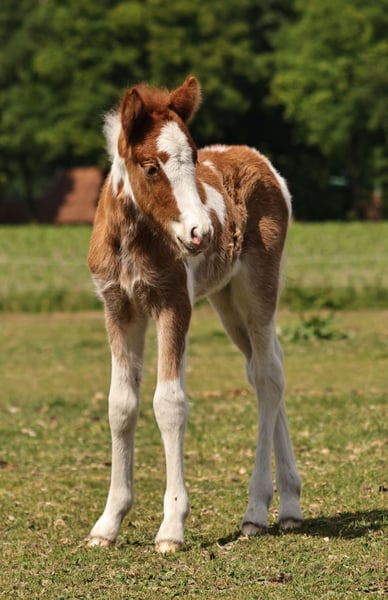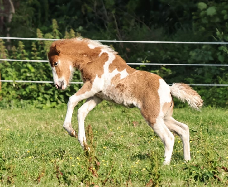 Handsome Aska vom Röttgershof is looking for a loving home! - a beautiful mare born on 17.05.2025 - her color is chestnut pinto, possibly with the roan gene. I'm also completely in love with her beautifully marked blaze! - 5-gaited, she already shows a nice separation of tölt and trot. - sweet character, loves to cuddle but is not pushy. - mother: Meyla von der Haard, a fantastic, well-behaved pony that I ride with much love. - father: Skuggi frá Skeggstödum, a nice character with fantastic gaits! He has just returned home from being backed by Marieke Weber. - both mother and father can be admired at our place. Feel free to send a message for more info, videos, or photos!