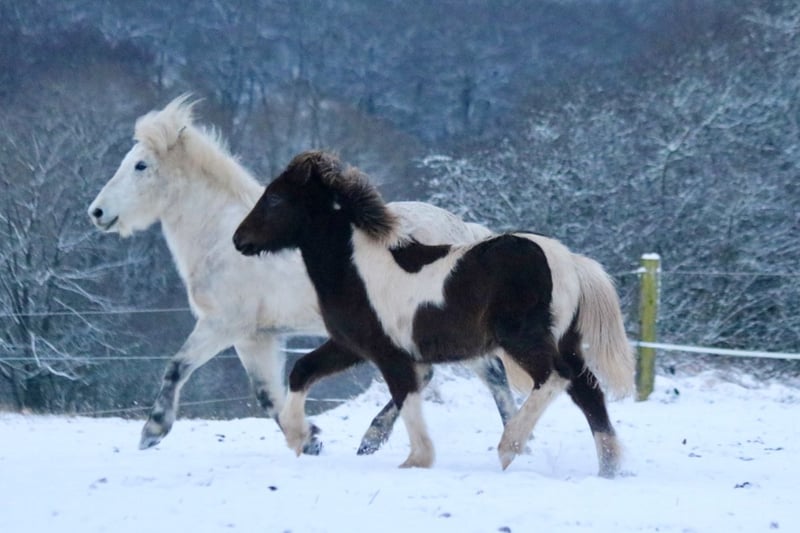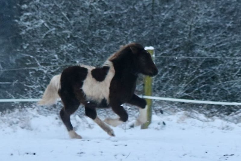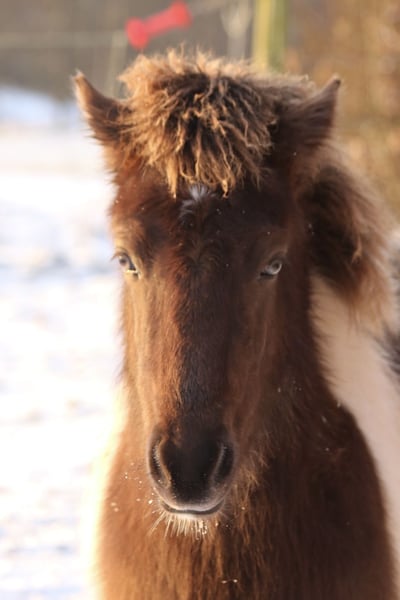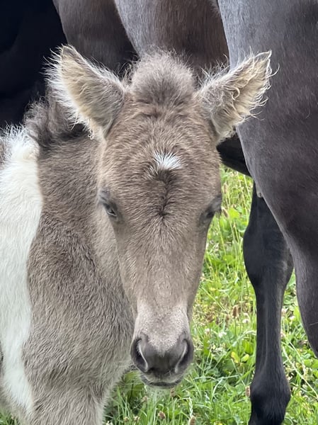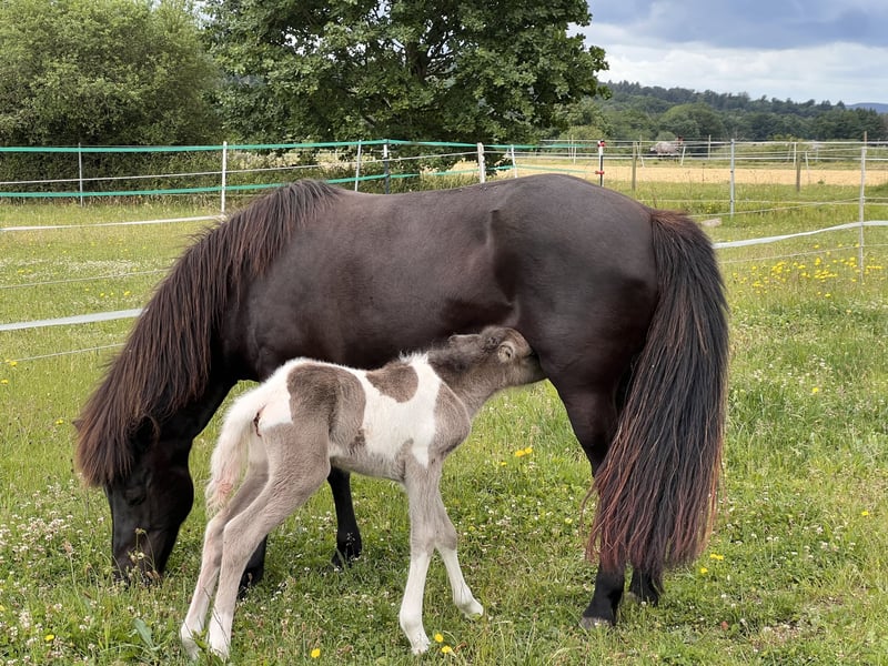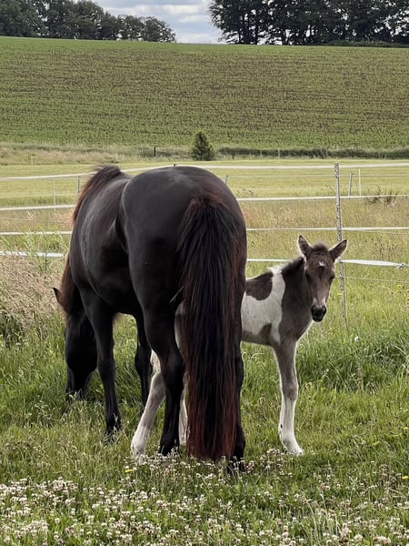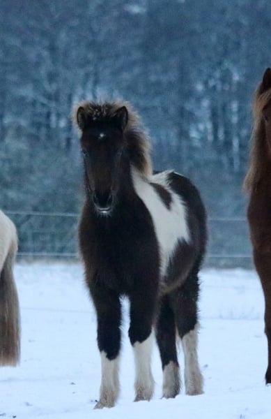 Njóla vom Birkenberg, ein außergewöhnlich schönes, mutiges, ausbalanciertes Stutfohlen mit klar getrennten Gängen, in der seltenen Farbe Rappisabellschecke. Vom Zuchtverband mit 8/8,5/8,5 bewertet, genau wie die Mutter Pálina vom Bienwald, eine große 5-Gangstute mit extrem gutem Gebäude, sehr gutem Tölt und Galopp, sowie viel Pass und gutem Trab und Schritt (Noten bis 7 auf Turnier). Der Vater ist 100% Crem Vererber, 50% Schecke, groß und kräftig. IGV Deutscher Meister mit klarer Gangtrennung. Njóla ist sehr entspannt im Umgang, gibt Hufe und lässt sich aufhalten. Sie ist im Herdenverband aufgewachsen, regelmäßig entwurmt und einfach nur „Zucker“. Sie kann gerne zur Aufzucht bleiben und wird nur in die passenden Hände verkauft. Gangpferde Birkenhof 0151-67580759