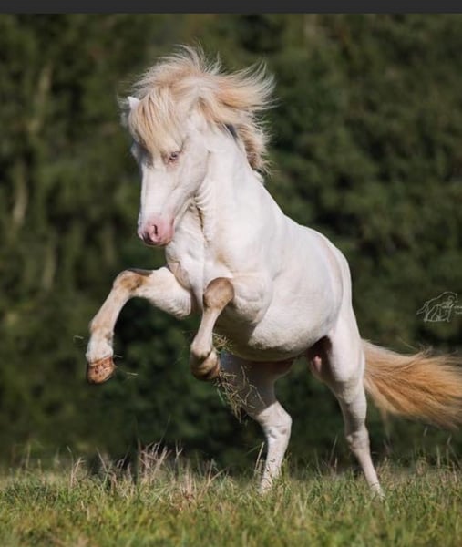 Njóla vom Birkenberg is an exceptionally beautiful, brave, and well-balanced filly with clearly separated gaits, presented in the rare color of a roan sabino. Rated 8/8.5/8.5 by the breeding association, just like her dam Pálina vom Bienwald, a large five-gaited mare with an outstanding conformation, excellent tölt and canter, as well as good passage, walk, and trot (scores up to 7 in competitions). Her sire is a 100% Cremello stallion, 50% sabino, tall and strong. He is an IGV German Champion with distinct gait separation. Njóla is very calm and easy to handle, willing to give hooves and to be held. She grew up in a herd, is regularly dewormed, and is simply a “sweetheart.” She can stay with her dam for breeding or raising purposes and will only be sold to the right, experienced home. Gaited horses Birkenhof 0151-67580759