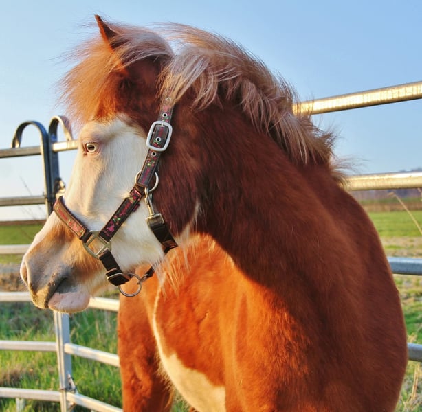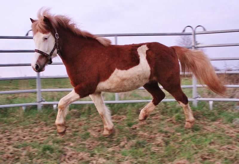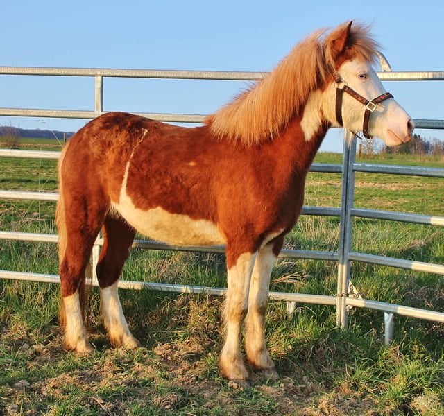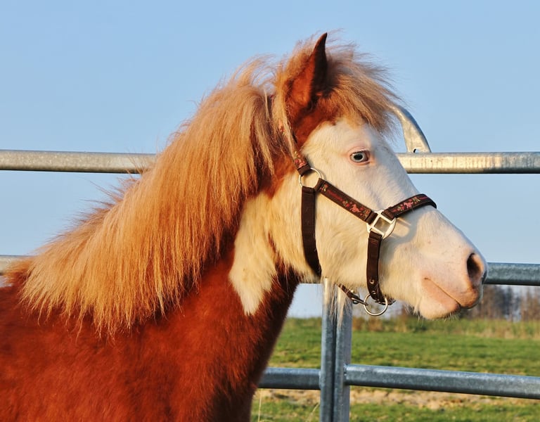 Rúbý - junge Fuchshelmscheckstute (AAeeSW1/SW1) aus 2023 - Nachwuchspferd für Freizeit und mehr... Rúbý ist bei mir geboren, seit Geburt gesund, Ekzemfrei, entwurmt und Hufe gepflegt. Sie ist geimpft und Hufpflege- wie auch Verladefromm. Kennt es geputzt zu werden und steht dabei brav und gechillt, lässt sich stehts brav Halftern und auch das Führen klappt in der Regel gut. Aktuell ist sie wieder in einer etwas komischen Wachstumsphase und wirkt teils etwas unharmonisch. Dadurch gehe ich davon aus das sie noch mehr an Größe und Fundament zulegen sollte. Durch ihr eher kräftigeres Grundfundament sollte sie später Kinder bis normalgewichtige Erwachsene gut abdecken können. Eine absolut freundliche und menschenbezogene Stute mit großer Neugierde. Auf der Weide ist sie immer eine der ersten die zu einem kommen und auch sonst stehts überall mit der Nase mit dabei. Vom Temperament eher ausgeglichen ist sie stehts Kopfklar mit viel Freude am Lauffen. Aktuell bevorzugt sie ihre sicher vorhandenen Grundgänge und zeigt aber auch immer wieder mindestens Tölt im Übergang oder je nach Situation auch Streckenweise den Tölt. Eine Passveranlagung kann aktuell noch nicht ausgeschlossen werden. Ich sehe sie später mit passendem Beritt und Ausbildung als gehobenes Freizeitpferd für klein und groß mit der Option auf kleinen Sport und Zucht. Mit ihren fast 3 Jahren ist auch die Wartezeit bis man sie anarbeiten kann nicht mehr ganz so lange hin. Aufgrund ihres aktuellen Wachstumsschubs würde ich von einer Überlegung zum Belegen in diesem Jahr eher absehen. Als potentielle Zuchtstute wäre sie zusätzlich ein Farbgarant da ihre Nachzucht immer nur Braun oder Fuchs basiert sein kann und stehts zu 100 % ein Splash-Gen erbt. Gerne kann sie im Nordsaarland angeschaut werden. Die Fotos sind aktuell, ein Video ist nicht vorhanden und kann derzeit auch nicht umgesetzt werden.