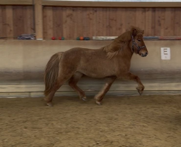 Vif von Möllenbronn is a friendly, five gaited, 3 year old young Fuschfalst mare. She has a very good pedigree. Her sire is LK1 in tölt, five gaits and pass and is himself elite tested. He is a son of Hrannar frá Flugumyri. Vif's dam ran successfully LK2 in sport (V1 and T1) with individual scores up to 7.0 for tölt, walk and trot. Vif is cooperative and friendly to handle. She is very uncomplicated in the herd. She shows all gaits with good ground coverage. Vif is growing up in a herd of young mares. She is regularly vaccinated and wormed. Foal test: Exterior: 7.8 Interior: 7.9 Gaits: 7.9 Overall: 7.87 Judges' verdict: Self-confident, well-built foal with lots of natural tölt and good gait distribution, energetic hindquarters, lots of speed and clear race passages