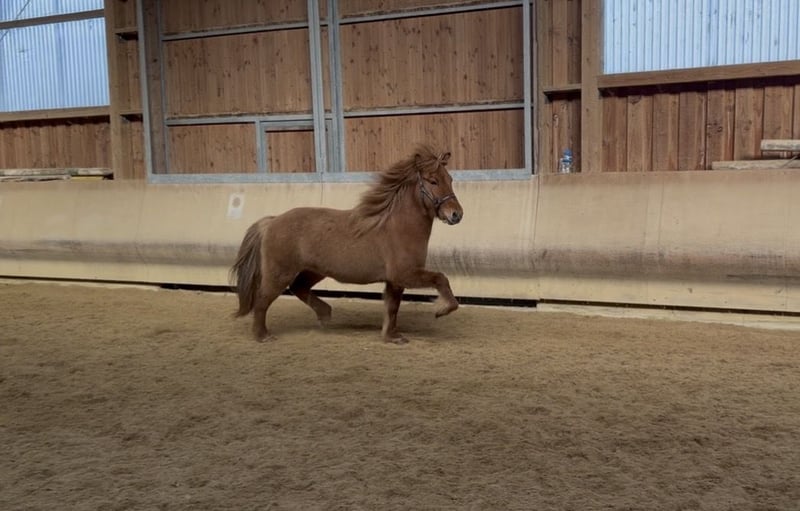 Vif von Möllenbronn es una yegua joven de tres años con una excelente disposición de cinco aires. Tiene un pedigree muy bueno. Su padre es LK1 en Tölt, cinco aires y Pass, y ha sido aprobado como élite. Es hijo de Hrannar frá Flugumyri. La madre de Vif compitió con éxito en LK2 en deportes (V1 y T1) con notas individuales de hasta 7,0 en Tölt, paso y trote. Vif se muestra cooperativa y amigable en el manejo. Es muy sencilla en el grupo. Al estar suelta, muestra todos los aires con buen alcance. Vif crece en un grupo de yeguas jóvenes. Está vacunada y desparacitada regularmente. Evaluación de potros: Exterior: 7,8 Interior: 7,9 Aires: 7,9 Total: 7,87 Veredicto del juez: Potro seguro de sí mismo, bien erguido, con mucho tölt natural y buena distribución de aires, con una parte trasera enérgicamente utilizada, mucho ritmo y claros inicios de renpass.