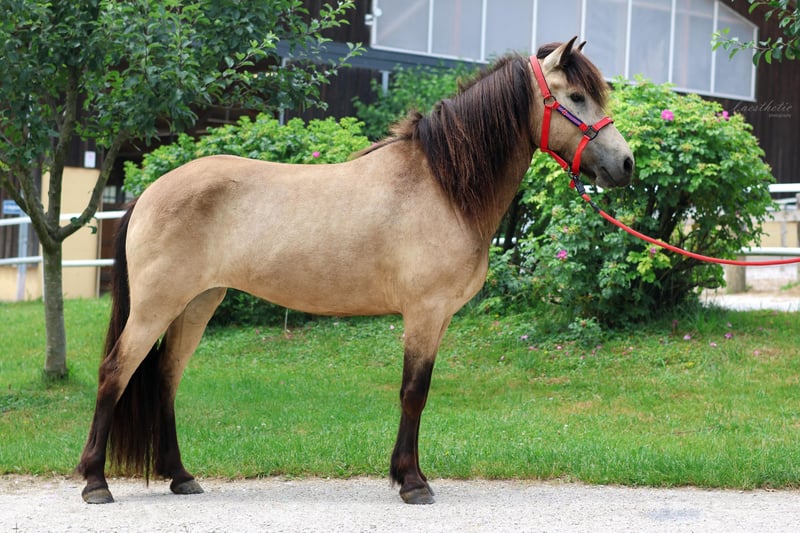 Auðey van Panoramahof – Expressief, veelbelovend, exclusief! Merrie | 2021 in AT | 1,44 m | Aardkleur zonder aftekeningen | Viergangs | Te koop in opdracht V: Gódur-Greifi frá Stóra-Hofi (8,46 totaal, 8,63 RE) VV: Ódur frá Brún (8,34 totaal, 8,90 RE) M: Aurea van Panoramahof MV: Bekan frá Kolsholti 2 Auðey is een jonge merrie met dat beetje extra: zeldzame kleur, dicht behang, harmonieuze lichaamsbouw – en vooral: bewegingsvermogen! Haar draf is energiek en elastisch, de galop is bergopwaarts gesprongen en uitgebalanceerd. Tölt aanleg is aanwezig, maar staat door haar jonge leeftijd nog in de kinderschoenen. Momenteel bevindt Auðey zich in de basisopleiding. Ze toont zich oplettend, moedig en karaktersterk – een merrie met aanwezigheid en uitstraling, die ervaren ruiters aanspreekt die een onbeschreven paard met veel potentieel zoeken. Ze is gewend aan de open stalhouding in een gemengde kudde, evenals boxenhuisvesting, en toont zich vriendelijk en duidelijk in de omgang. In de kudde is ze ranghoog en soeverein. Auðey is eczeemvrij, is nooit ziek geweest en is momenteel onbeslagen. Bijzonder spannend: Auðey is met 8,01 in het stamboek opgenomen – een duidelijke verklaring van haar kwaliteit! Voor 2026 is ze drachtig van de elitehengst Jarl frá Jadri (het veulen is momenteel niet te koop). Zoek je een jong paard met charisma, uitstekende afstamming en perspectief voor fokkerij of paardensport? Dan zou Auðey wel eens jouw match kunnen zijn! Wil je Auðey leren kennen? Stuur ons een e-mail naar: reiten@burghauser.at