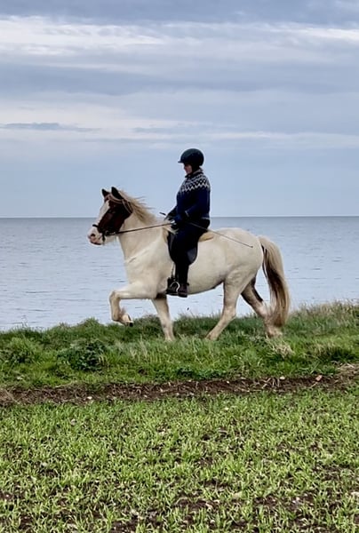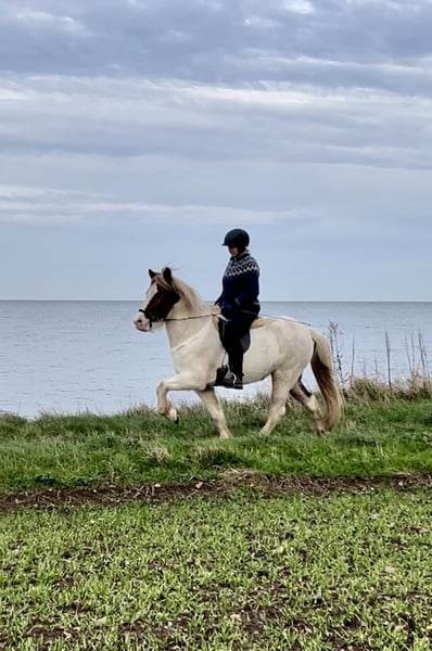 Afródíta ist eine auffallend große (Stm. 147 cm) und talentierte 6j. Fünfgangstute aus deutscher Zucht. Sie hat eine gleichmäßige Gangveranlagung und viel Tölt und bringt dabei ein ansprechendes Bewegungspotenzial mit. Dies macht sie nicht nur als luxuriöses Reitpferd interessant, sondern sie wäre auch geeignet als Turnierpferd für einen (jungen) Reiter mit Ambitionen. Afródíta ist ein ausgesprochen leichtrittiges Pferd, das schon gut an den Hilfen steht und die Hilfen sehr fein annimmt. Sie ist ganz leicht in der Hand und reagiert sensibel. Sie hat ein gut mittleres Temperament, ist dabei mit dem kleinen Finger (oder den Gedanken) zu reiten und möchte ihrem Reiter unbedingt gefallen. Sie arbeitet immer ganz motiviert mit ihrem Menschen und lässt sich sehr schon auf dem Viereck dressurmäßig reiten. Auf der Bahn macht das Gangtraining mit ihr viel Spaß und im Gelände ist sie aufmerksam und bleibt dabei immer bei ihrem Reiter. Sie ist bisher viergängig geritten worden. Sie hat viel Tölt mit guter Bewegung und schon sehr konstanter Form, die Grundgangarten sind ebenfalls sehr gut, wobei der Galopp durch das vermehrte Tölttraining derzeit etwas schwächer ist. Als sie noch nicht getöltet ist, konnte sie auf Anhieb auf dem Zirkel galoppieren, insofern sind wir uns sicher, dass das bald wieder zurück kommt. Der Trab hat guten Takt und Raumgriff, hier muss sie noch lernen, sich etwas mehr fallen zu lassen. Áfródíta benötigt aufgrund ihrer feinen Reaktionen einen einfühlsamen Reiter mit einem geschmeidigen Sitz und einer feinen Hand. Sie ist zu 100 % brav, würde aber die Einwirkung eines unsicheren Reiters oder unruhigen Sitzes nicht verstehen. Traumhaft ist sie für denjenigen, der ein fein zu reitendes Pferd zu schätzen weiß. Sie ist kerngesund, durchgeimpft, ekzemfrei und Zähne sind gemacht - ein Pferd zum losreiten und weiter fördern! Sie hatte 2023 unser jahrgangsbestes Fohlen, das Elite beurteilt wurde und das jetzt gut zweijährig bereits 143 cm groß ist.