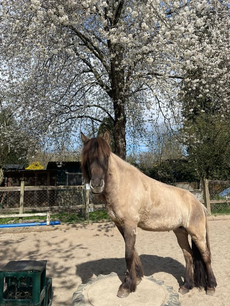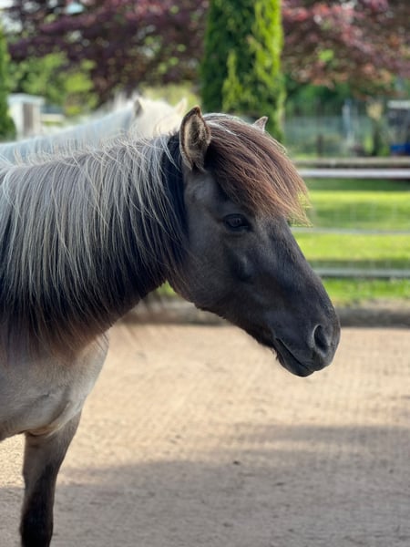 Kleine pfiffige Viergangstute Größe: 1,33 Farbe: Mausfalbe Geburtsjahr: 2017 Vater: Vidir fra Prestsbakka Mutter: Blika vom Blutbachtal Wenn alles passt würde ich Manadís in gute Hände abgeben. Sie hat 4 klar getrennte Gänge mit immer taktklarem Tölt. Sie hat Spaß am Reiten im Gelände in der Gruppe, hier ist sie auch sehr beliebt bei den Kindern unserer Reitschule. Sie mag Bodenarbeit, möchte immer mit und betüddelt werden Beim Trailreiten und auch im Straßenverkehr ist sie unerschrocken. Was sie nicht mag, ist die Arbeit in der Bahn. Sie erinnert mich dort eher an das graue Tier mit den langen Ohren. Aufgrund ihrer eigenen Ideen ist sie zur Zeit zumindest noch nicht als Anfänger- oder Kinderpferd geeignet. Da sie immer flott vorwärts geht und für Alles zu haben ist, macht sie erfahrenen Reitern sehr viel Spaß.
