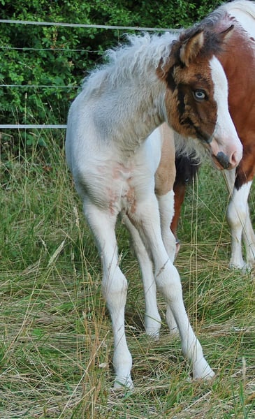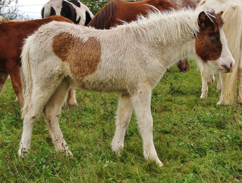 Bifröst, the rainbow or the gods' bridge from Earth to Heaven, is an individual mare foal with appealing quality and an excellent character. Due to a reduction, I am offering the chance to acquire this extraordinary filly. She has all the qualities to become a versatile riding and breeding horse in the future. Since her birth in May, she has grown up well-socialized in a functioning herd with regular human contact. Bifröst is healthy and free of eczema to date, from eczema-free parents. She is still with her mother but can be weaned at any time and move promptly to a new, loving, responsible home with other young horses. She is accustomed to humans, friendly, and curious. From birth, her hooves have been maintained as needed, and she is also regularly dewormed. Through pasture turnout with a horse trailer, she has learned to load and has been exposed to potential dangers in a positive way. Bifröst has a harmonious, slightly sporty yet stable build. Based on her parentage, she is expected to reach an approximate height of 14.0 hh with an elegant, strong exterior. Her mother is a large, strong mare registered in the first studbook, daughter of Heljar frá Brekknakoti. Heljar is currently the highest tested Helmschecke worldwide. Her father impresses with good gaits, a "Wow" factor, and a pedigree including Bekan frá Kolsholti 2 – a sport and riding horse suitable for everyone, qualified for Sport A, Skarði from Vindstaðir – world champion and Sport A, and Djarfur frá Lukkubæ – multiple German youth and junior champion, along with legendary breeding horses Glampi frá Vatnsleysu and Sveinn-Hervar frá Þúfu í Landeyjum. Bifröst herself is a five-gaited mare, and during her first months, she frequently exhibited natural tölt and occasionally pace while grazing. Her walk is rhythmically correct, and she now shows a secure and appealing trot. Her canter often has an uphill tendency. She displays all gaits with a lot of expression, joy of movement, space coverage, and good posture. She has a slightly higher temperament, although she usually behaves quite balanced. Bifröst is an extremely unique and pretty filly, distinguished by her distinctive pinto markings and two blue eyes. She is a guaranteed color producer, being a tested homozygous pinto, meaning all her offspring will be 100% pinto when used for breeding. Additionally, genetic tests confirm that she is a cremello and splash carrier. A true gem in terms of color genetics with a guarantee. Originally, I intended to keep her, so there are few photos and no videos available. However, she is very welcome to be personally introduced by appointment. Transport within Germany is possible upon arrangement. If you are genuinely interested in her, I look forward to hearing from you.