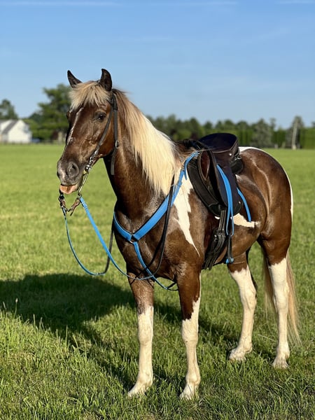 VERFÜGBAR beim Online-Pferde-Auktion unter www.DOT-MagicHorseAuction.DOT-com GEBOT AB JETZT BIS DIENSTAG, 28. OKTOBER! – SOFORTKAUF MÖGLICH! *Der Endpreis wird auf der Auktionsseite festgelegt* KONTAKT DES AUKTIONSGEBERS: Hannah Zorn, 917-821-4140 STANDORT: Lebanon, NJ „Cadbury ist ein sehr fröhliches Pferd, das auf der Suche nach seinem nächsten Abenteuerpartner ist. Er ist ein Schokoladen-Silber-Dapple-Pinto-Mountainhorse-Wallach, 14,2 hh groß und 12 Jahre alt. Er ist ein Allround-Trailpferd, das bereits ausgiebig beim Campen und Trailreiten im Einsatz war. Er ist gut im Umgang mit Hunden, Nutztieren, Fahrrädern, Autos, Rollstühlen, Kletterern und Motorrädern. Er geht problemlos über Gitter, Baumstämme, Brücken, Felsen sowie durch Buschwerk, Schlamm oder Wasser. Er lässt sich problemlos baden, anbinden, verladen, in den Anhänger stellen, crosstieen, lungieren, für das Satteln und Zäumen bereitstellen. Er kann vorne oder hinten geritten werden, geht auch allein aus und ist nicht herdgebunden, sondern kehrt ruhig zum Trailer zurück. Er zeigt keine Tritte, Buckeln, Steigen, Durchgehen oder Schlagen und hat nur wenig Angst. Er kommt gut mit Stuten und Wallachen zurecht, kann tagsüber in der Box oder 24/7 draußen stehen. Er ist ein vorwärts orientiertes Pferd und absolut sicher für einen Reiter mit mittlerem Niveau. Für ein selbstbewusstes Kind, das reiten kann, wäre er ebenfalls ideal. Er macht gelegentlich beim Nicht-Galoppieren Geräusche, was nur ein Soundeffekt ist. Er ist nicht beunruhigt und macht das unter dem Sattel nicht. Ich reite ihn in einem Hackamore, er kann aber auch mit Gebiss geritten werden. Ich besitze ihn seit 2,5 Jahren, und er hatte keine gesundheitlichen oder hufrehebedingten Probleme. Er ist aktuell entwurmt, zahn- und impfmäßig auf dem neuesten Stand, inklusive Tollwut. An seinem Hinterhuf befindet sich eine Narbe am Hufrand, die von meinem Tierarzt als kosmetisch eingestuft wird und keine Probleme verursacht. Er hat in der Vergangenheit professionelle Ausbildung genossen und ist ein echtes Trail-Highlight!“