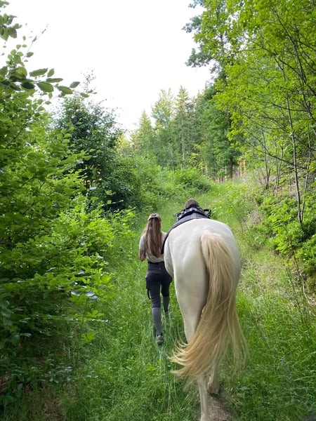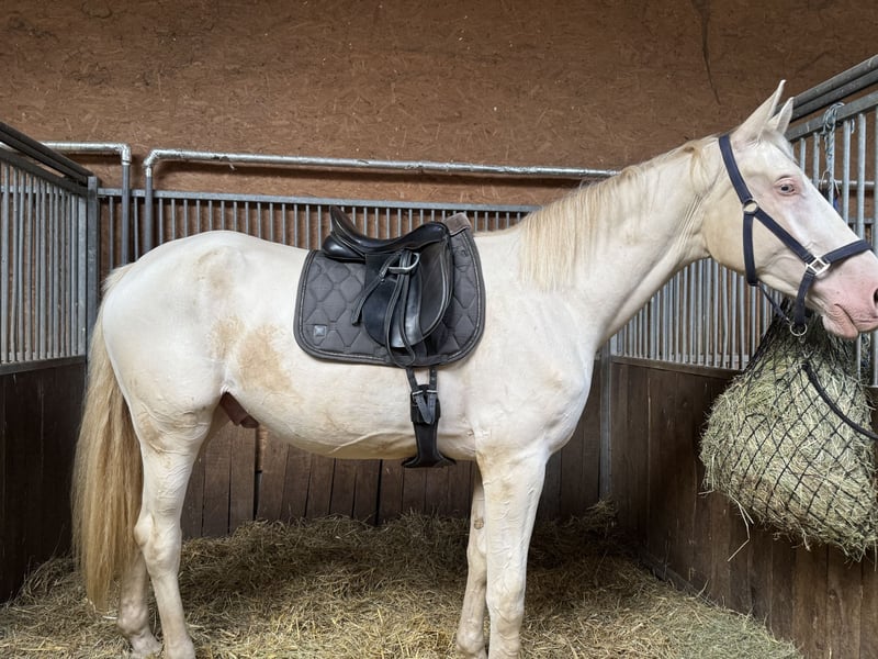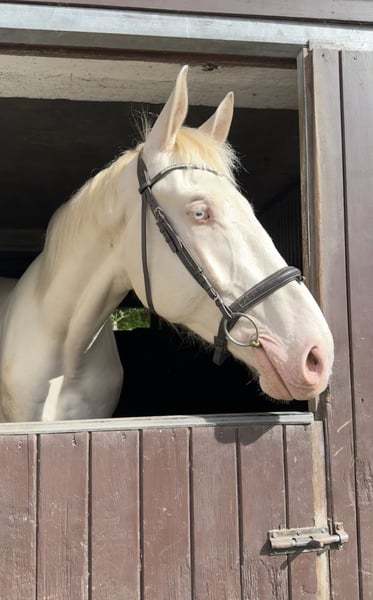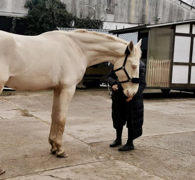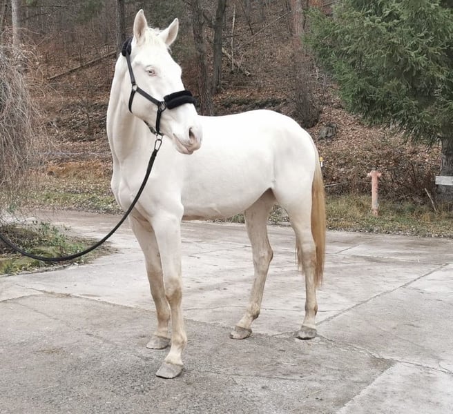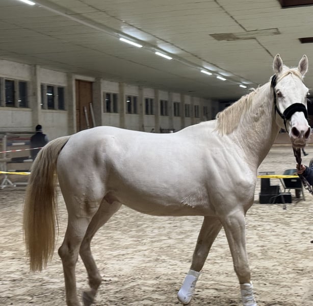 Czech Warmblood Kinsky – Cremello – 3 years old – approximately 16.1 hh I am offering an impressive 3-year-old Kinsky gelding (will turn 4 in April) in the rare color Cremello. Current height is around 180 cm (approximately 16.1 hh), with a solid and strong build. Good pedigree, sire competes in eventing, and dam jumps up to 120 cm. The gelding is still quite green and therefore requires an experienced handler who can gently develop and promote his potential. Due to his age, size, and temperament, he is not suitable for beginners. The Kinsky is distinguished by his noble appearance, good movement, and a motivated and willing character. He is healthy, with only a benign swelling on his right front leg, which causes no issues. Housing requirements: He would thrive in a setting where he can be outside from early morning until late afternoon, in summer and winter. Ideally, he would be kept in a paddock or a loose box with access to turnout, and someone with whom he can play and run, as he is still very playful. He is definitely not aggressive towards other horses. Reason for sale: Due to my pregnancy, I am currently unable to give him the attention he needs and will need in the future. It is with a heavy heart that I am looking for a suitable new home for him.